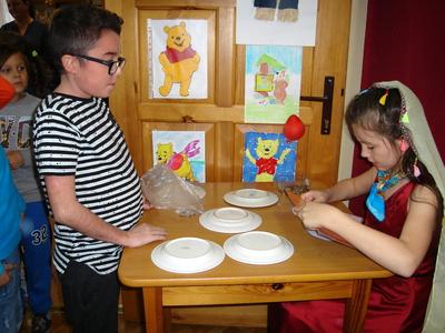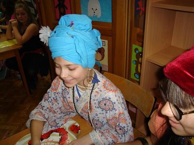 Ubrani w kolorowe stroje andrzejkowe - wróżki i jeden "wróż", spisali się na medal! Przez cały dzień ciężko pracowali służąc odwiedzającym swoją „magiczną” wiedzą. Bardzo dziękujemy za pomoc!