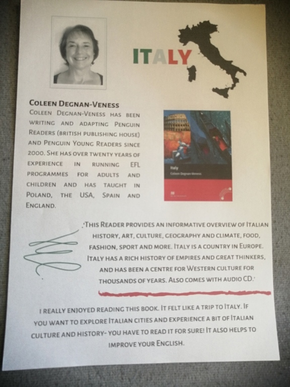 Przez pierwsze dwa tygodnie czytaliśmy ksiązki anglojęzyczne albo i nie, a następnie przygotowaliśmy projekty uwzględniające notkę biograficzną autora przeczytanej książki, jej krótką recenzję i rekomendację- warto po tę lekturę sięgnąć, czy nie? Oczywiście wszystko w języku angielskim J