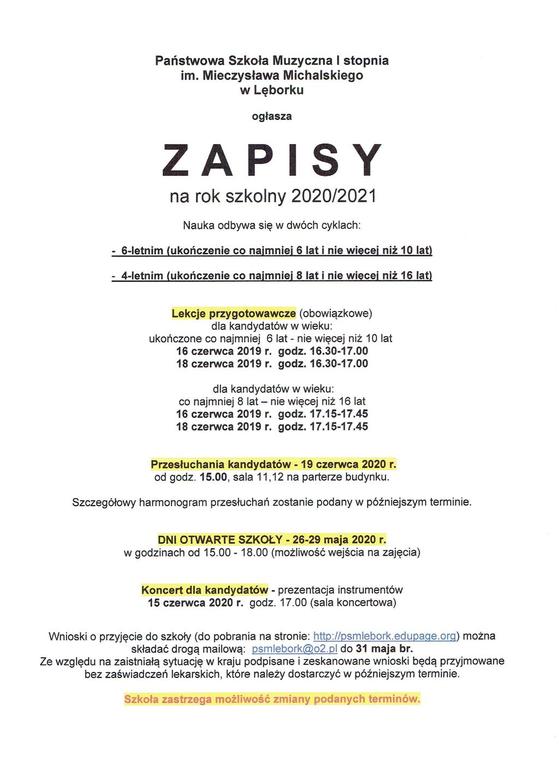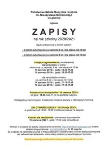 ZAPISY do PSM I stopnia w Lęborku PSM I stopnia w Lęborkuogłasza zapisy. Galeria zdjęć Powiązane wiadomości ŚWIĘTO UCHWALENIA KONSTYTUCJI 3 MAJA, ŚWIĘTO PRACY,... Biel i czerwień Ogólnopolski Konkurs Historyczny ,,Losy żołnierza... ZAPISY do PSM I stopnia w Lęborku Informacja Urzędu Miejskiego w Lęborku na temat... Plebiscyt „Super Książka czasu koronawirusa” Drukuj Udostępnij Data dodania: 04.05.2020 Wyświetlono: 428 Aktualności