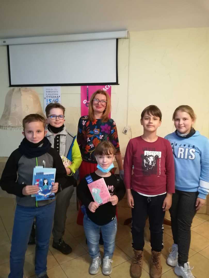 15 października pięcioro uczniów z kl. IVe wraz z wychowawcą wzięło udział w spotkaniu z pisarką Agnieszką Tyszką. Mieli okazję dowiedzieć się, jak powstają opowieści, skąd autorka czerpie pomysły, jak powstają ilustracje do jej książek. Druga część spotkania miała charakter warsztatowy. Pod kierunkiem autorki uczniowie tworzyli własne teksty literackie. Po spotkaniu był czas na zakup książek i pozyskanie autografów.