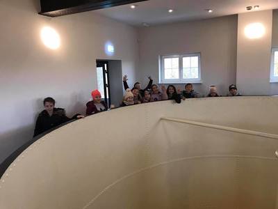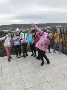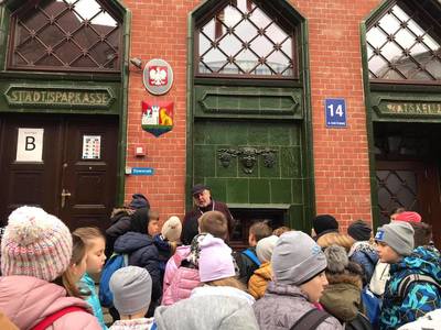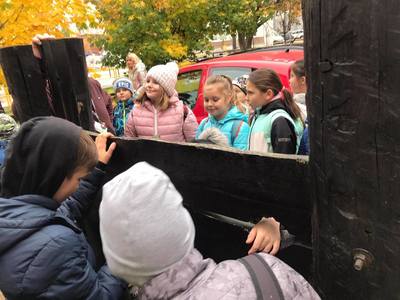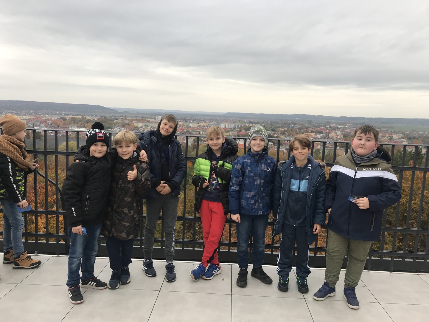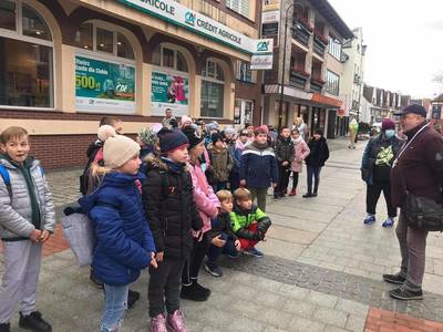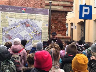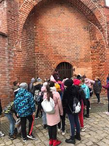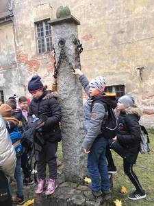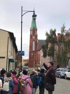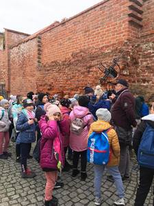 Spacerek trasą średniowiecznego Lęborka rozpoczęliśmy od zbiórki przy Lęborskim Węźle Przesiadkowym. Nie mogło też zabraknąć pamiątkowego zdjęcia przy wyremontowanej lokomotywie stojącej przed budynkiem dworca. Stamtąd udaliśmy się przed gmach Liceum Ogólnokształcącego nr 1. Następnie przeszliśmy się ul. Staromiejską, a u zbiegu Staromiejskiej i Skłodowskiej zapoznaliśmy się z ustawioną tam tablicą ilustrującą całą trasę. Idąc brukowaną uliczką Skłodowskiej, doszliśmy do skrzyżowania z ul. Armii Krajowej. Tam zwiedziliśmy z zewnątrz budynek Ratusza i poznaliśmy dawną miarę metryczną ustanowioną przez Zakon Krzyżacki - pręt chełmiński. Pręt chełmiński na obecnym Ratuszu w stanowi nawiązanie do tamtych czasów i przypomina, jakie były początki miasta i skąd się wziął obecny wygląd jego centrum. Naszym następnym punktem była Baszta Bluszczowa oraz świeżo odnowione mury obronne. Po drodze zatrzymaliśmy się na chwilę przy Sanktuarium św. Jakuba, a stamtąd udaliśmy się na krótki odpoczynek na Plac Pokoju. Kolejnym punktem zwiedzania było Muzeum w Lęborku umiejscowione w kamienicy rodziny Nipkowów. Niestety podczas tej wycieczki nie zwiedziliśmy go od wewnątrz. Czas na gonił, więc wyruszyliśmy dalej. Gdy tylko minęliśmy zabudowania młyna, ujrzeliśmy zamek krzyżacki. Na dziedzińcu zamku przykuły naszą uwagę dyby i pręgierz. Nieopodal pożegnaliśmy się z naszym przewodnikiem. Postanowiliśmy jeszcze zwiedzić Wieżę Ciśnień, znajdującą się w Parku im. Bolesława Chrobrego. Z powstałej obecnie platformy widokowej podziwialiśmy miasto i okolice. Pogoda nam dopisała. Wycieczka była udana, zadowoleni wróciliśmy do szkoły. Zapraszamy do naszej foto galerii.
