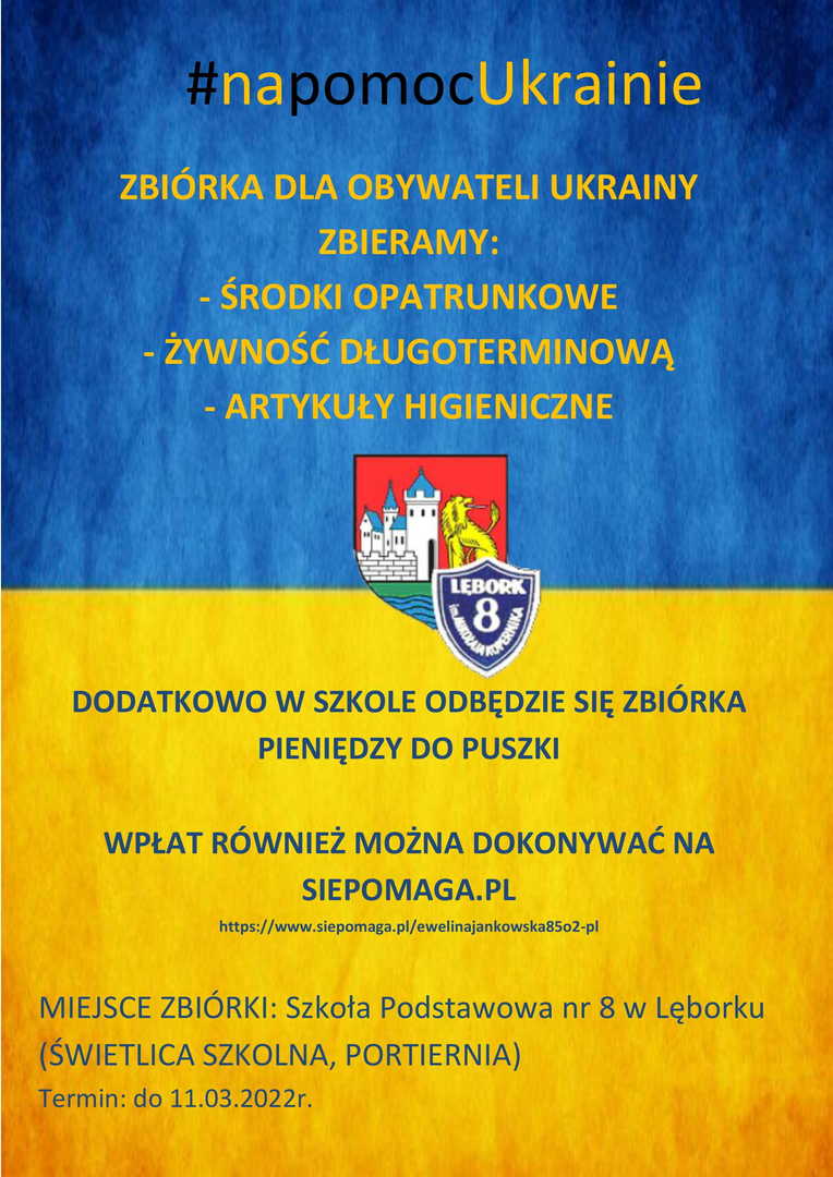 Pomoc SP8 dla Ukrainy Link do wpłat https://www.siepomaga.pl/ewelinajankowska85o2-pl Bądźmy razem! Galeria zdjęć Powiązane wiadomości Ferie w obiektywie Zajęcia informatyczno-przyrodnicze w czasie ferii I po feriach... Pomoc SP8 dla Ukrainy Apel Dla Ukrainy Drukuj Udostępnij Data dodania: 26.02.2022 Wyświetlono: 362 Aktualności