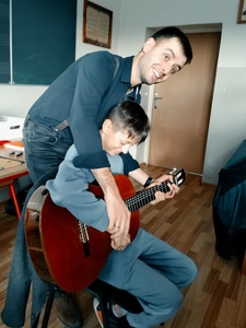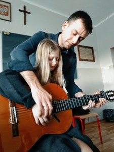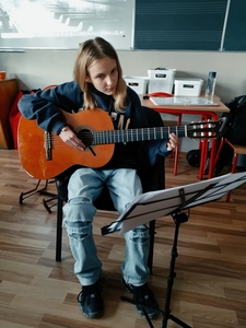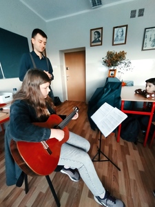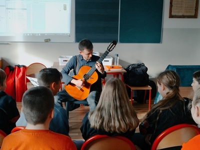W ostatnich dniach odbyła się seria pokazów gitarowych na lekcjach muzyki. Pan Mikołaj, prowadzący Szkołę Gitary Dudkiewicza, pokazał jak łatwo zagrać prostą melodię już podczas pierwszej lekcji. Kilkoro chętnych się znalazło i już zagrali, podczas gdy klasa śpiewała.