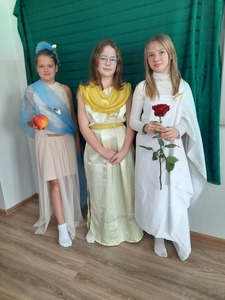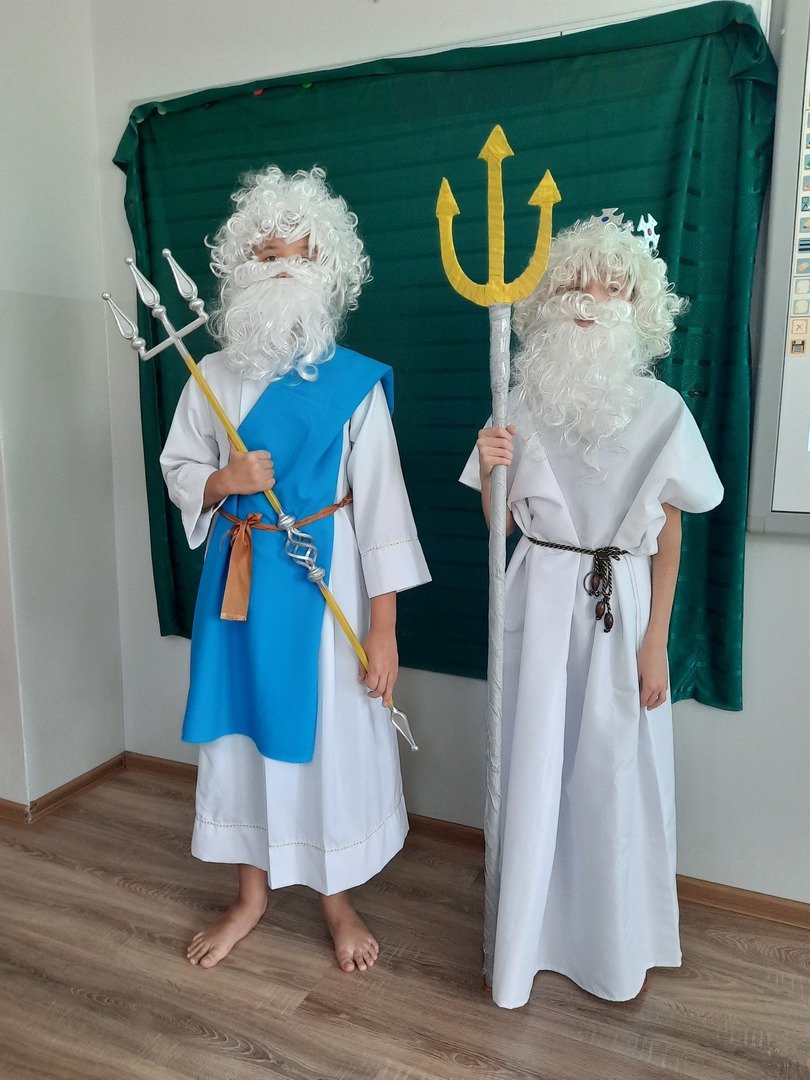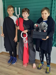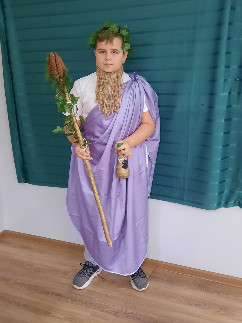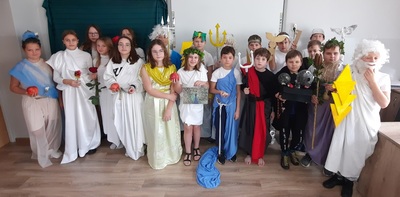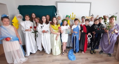 Uczniowie klasy Vc własnoręcznie wykonali kostiumy i wcielili się w role boskich mieszkańców Olimpu. Nie zabrakło Zeusa, Posejdona i Hadesa. Była także piękna Afrodyta, Dionizos, boski posłaniec Hermes i wielu innych. Taka kostiumowa forma edukacji przybliżyła uczniom świat greckich mitów i wierzeń mieszkańców starożytnej Hellady.