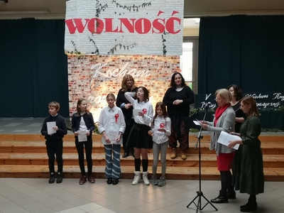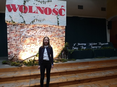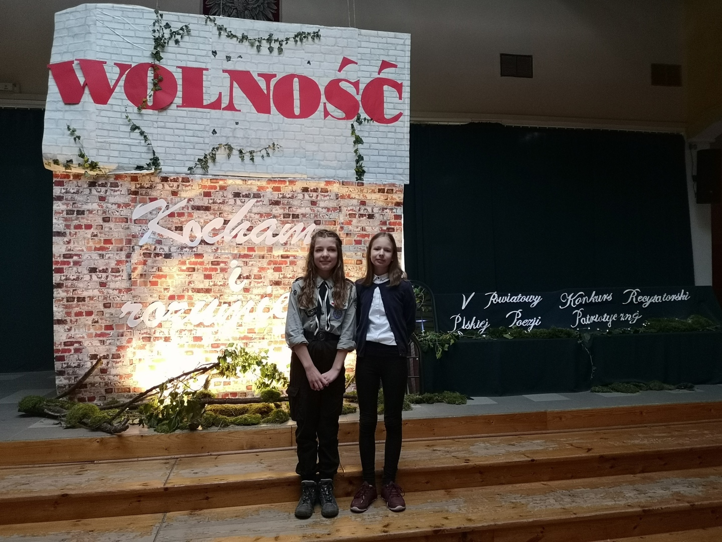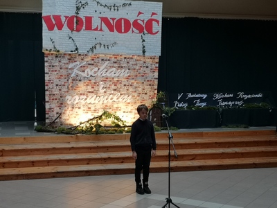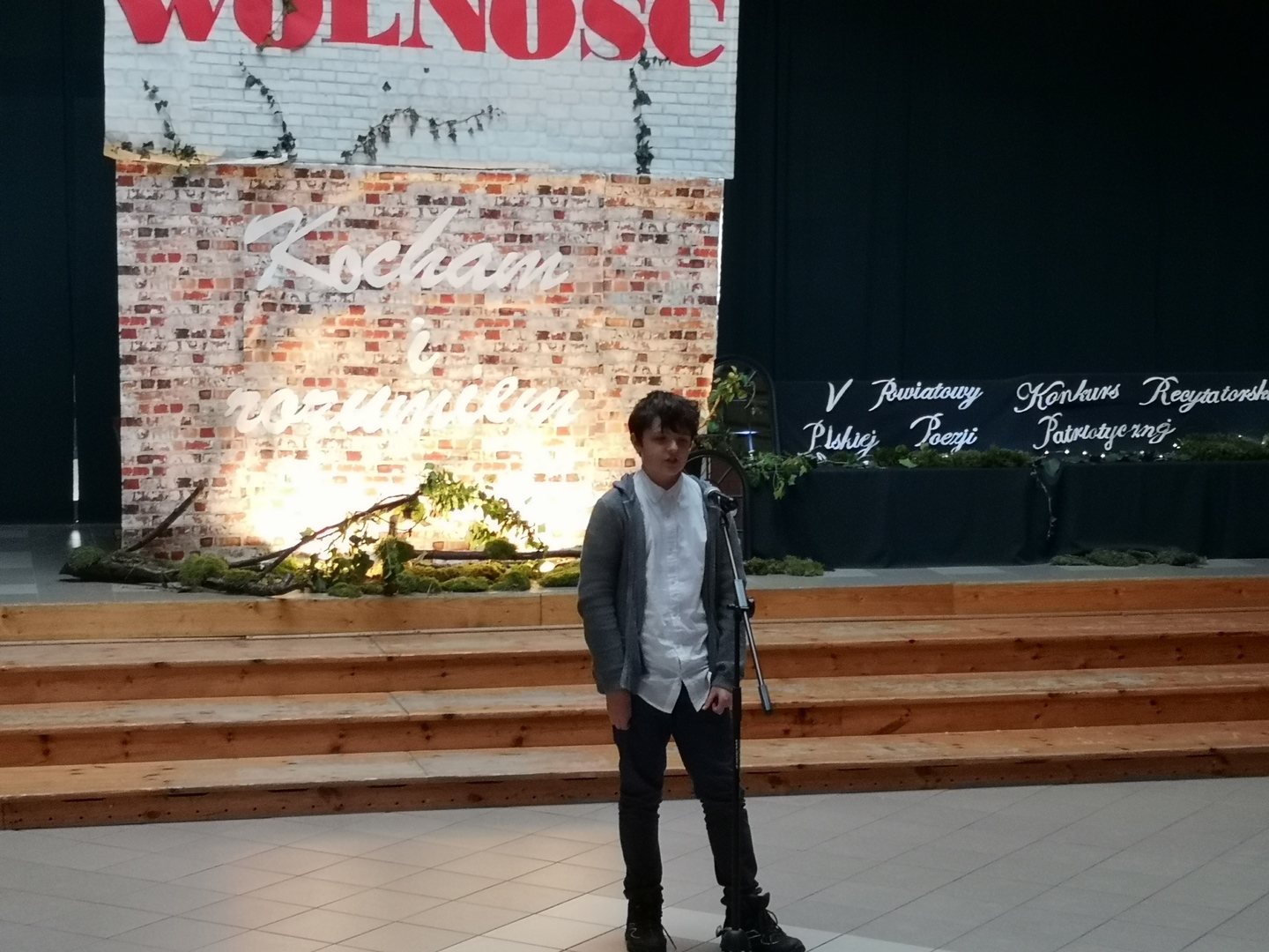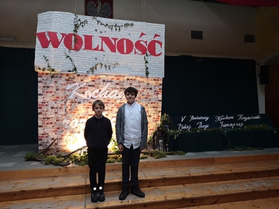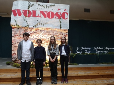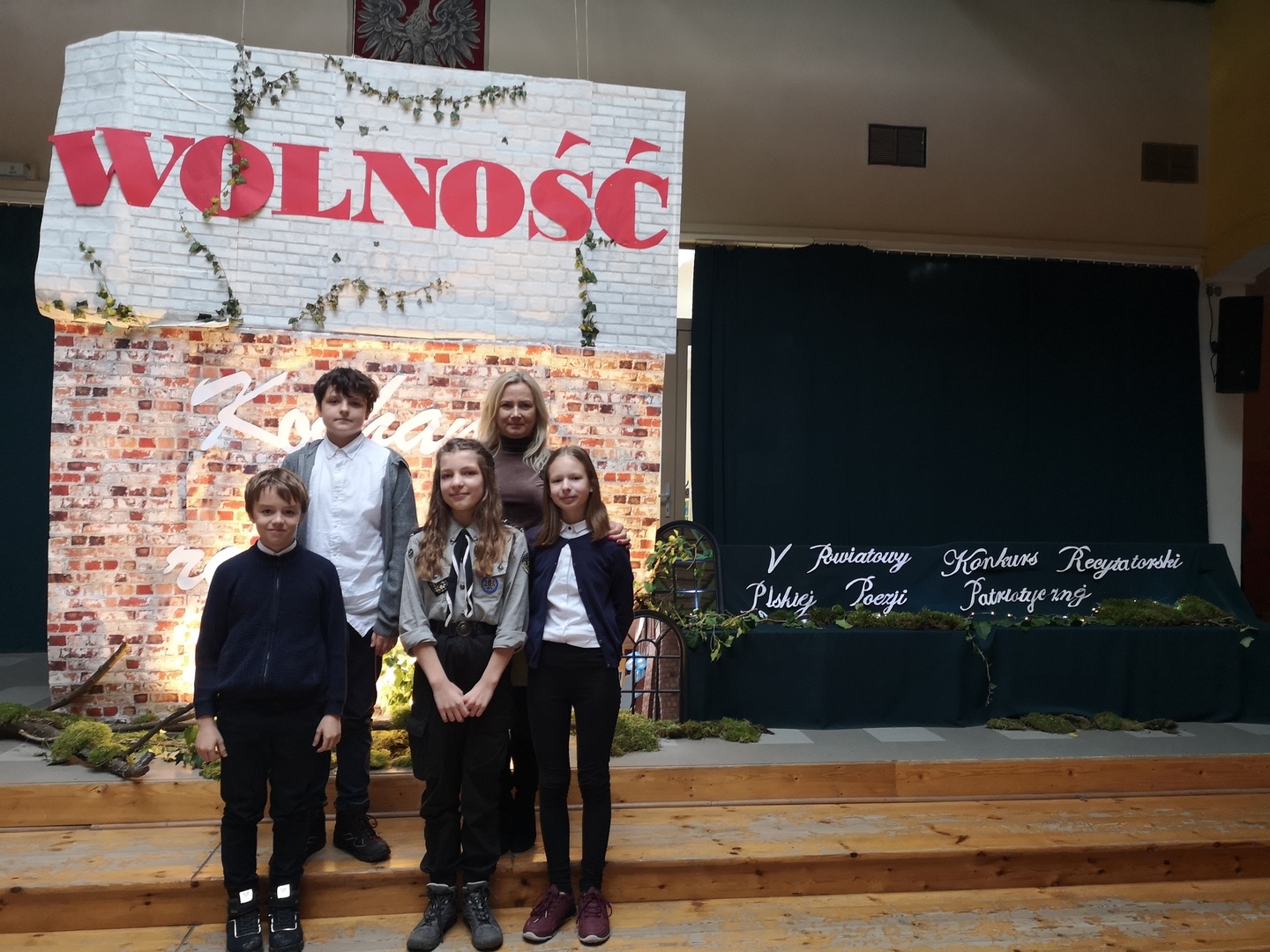 Czworo uczniów naszej szkoły - Dominik Ruciński, Kuba Łotowski, Dominika Klotzka, Magda Klukowska - wzięło udział w V Powiatowym Konkursie Recytatorskim Polskiej Poezji Patriotycznej organizowanym przez Szkołę Podstawową w Nowej Wsi Lęborskiej. Każdy uczestnik konkursu zaprezentował wybrany przez siebie wiersz o tematyce patriotycznej, poświęcony wojnie i okupacji. W kategorii klas IV-VI wyróżnienie zdobył Kuba Łotowski z klasy V d, natomiast w kategorii klas VII- VIII - Dominika Klotzka - uczennica klasy VIIc. Serdecznie gratulujemy!