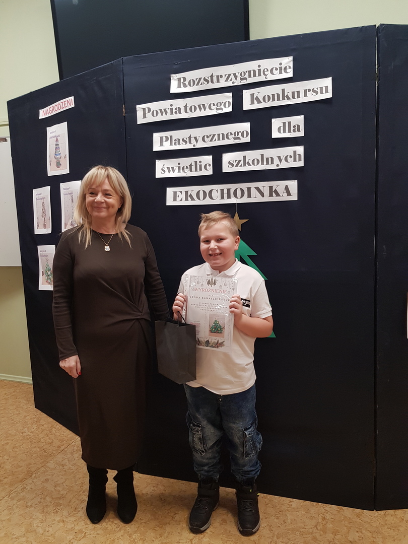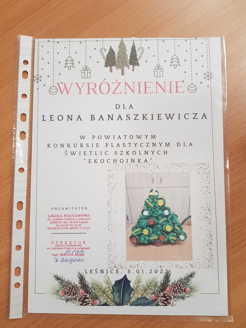 5 stycznia odbyło się uroczyste wręczenie nagród w Powiatowym Konkursie Plastycznym dla świetlic szkolnych "Ekochoinka", organizowanym przez Szkołę Podstawową w Leśnicach. Wyróżnienie zdobył wychowanek naszej świetlicy, uczeń klasy IC Leon Banaszkiewicz. Serdecznie gratulujemy Leosiowi i jego rodzicom pomysłu, chęci i wkładu włożonego w piękne wykonanie ekochoinki.