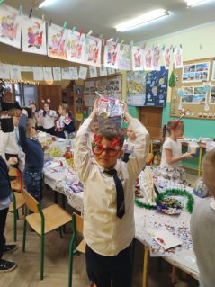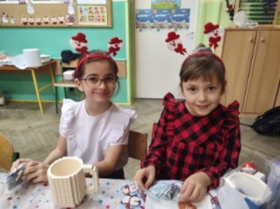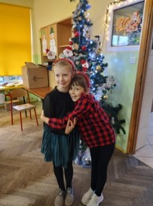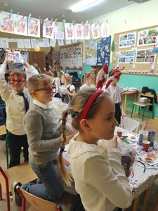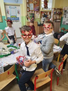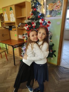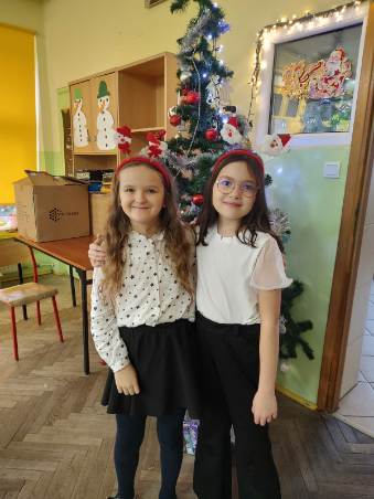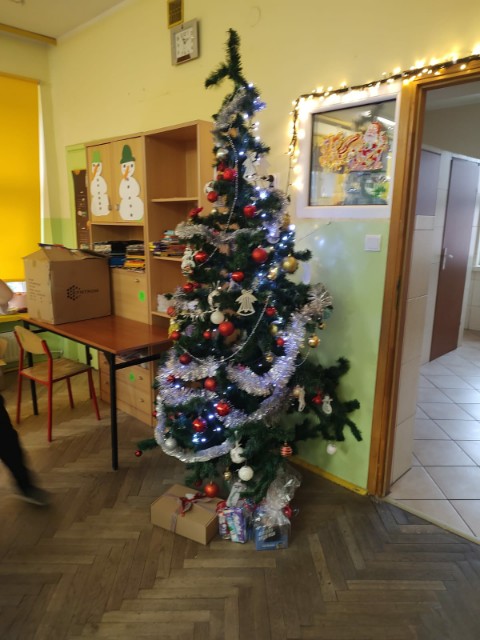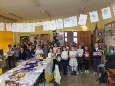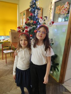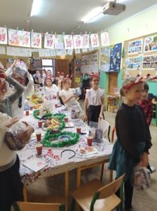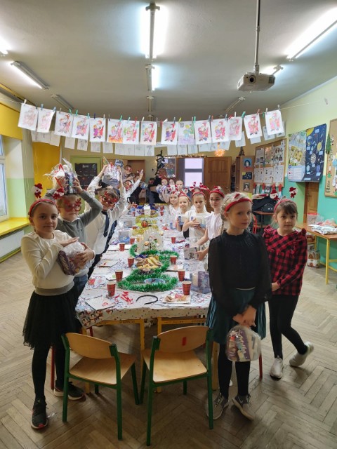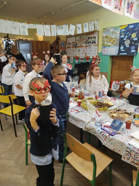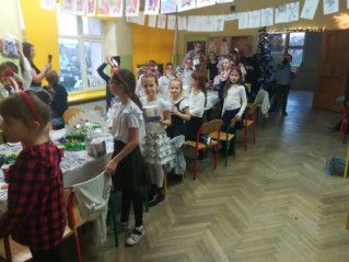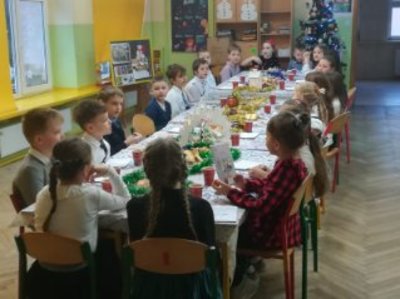 Uroczysta Wigilia rozpoczęła się montażem słowno-muzycznym w wykonaniu uczniów kl. IIa, potem było dzielenie się opłatkiem, składanie życzeń, upominki od Mikołaja i poczęstunek. Przy wspólnym stole w miłym świątecznym nastroju śpiewaliśmy kolędy i częstowaliśmy się smakołykami przygotowanymi przez rodziców. Radosna atmosfera udzieliła się wszystkim.