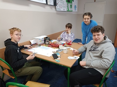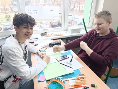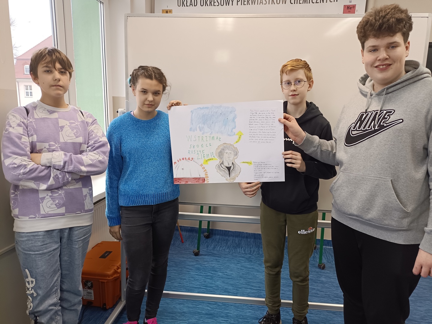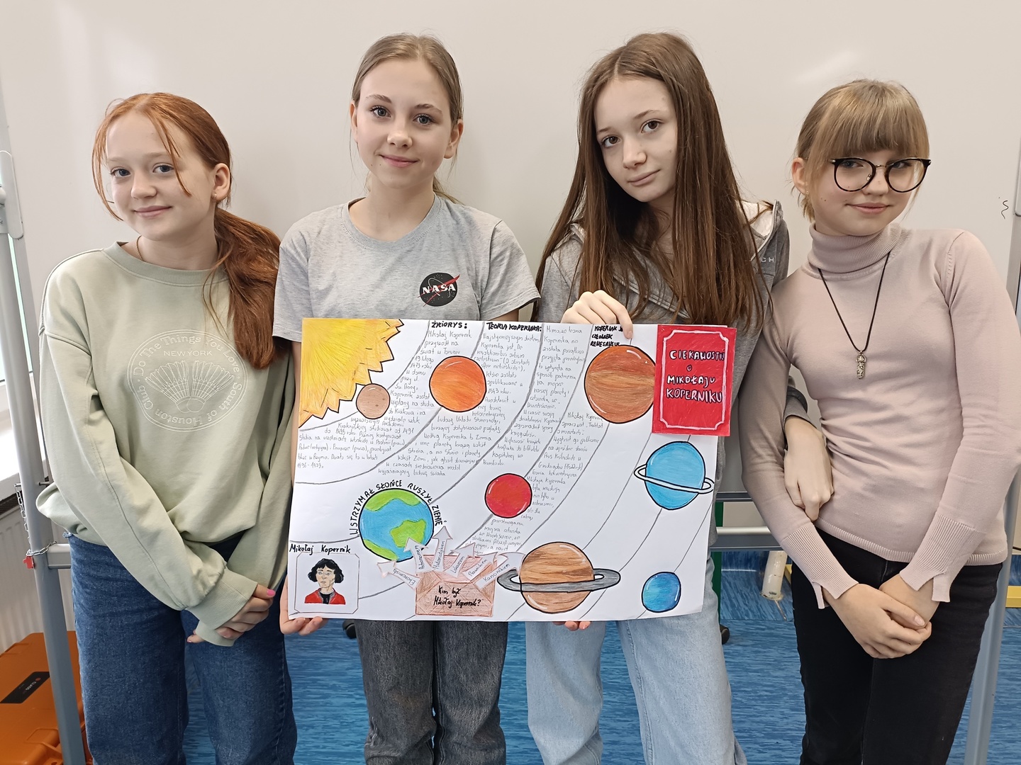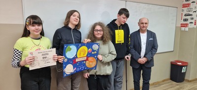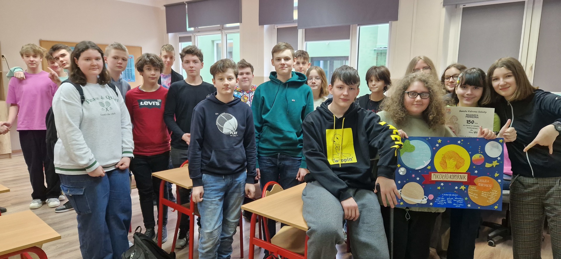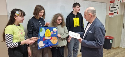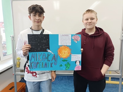 Z okazji Święta Patrona Szkoły uczniowie klas ósmych wykonali grupowe prace projektowe, które przedstawiały fakty i ciekawostki z życia patrona naszej szkoły, Mikołaja Kopernika. Zwycięska okazała się praca klasy 8a, za co uczniowie otrzymali w nagrodę czek opiewający na kwotę 150zł, z przeznaczeniem na potrzeby klasowe.