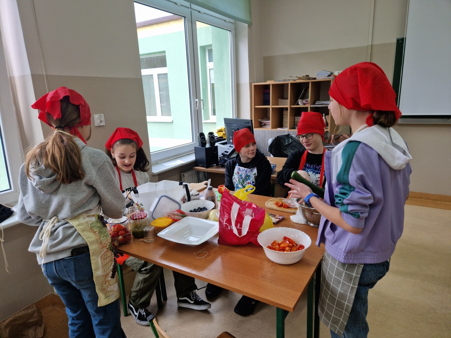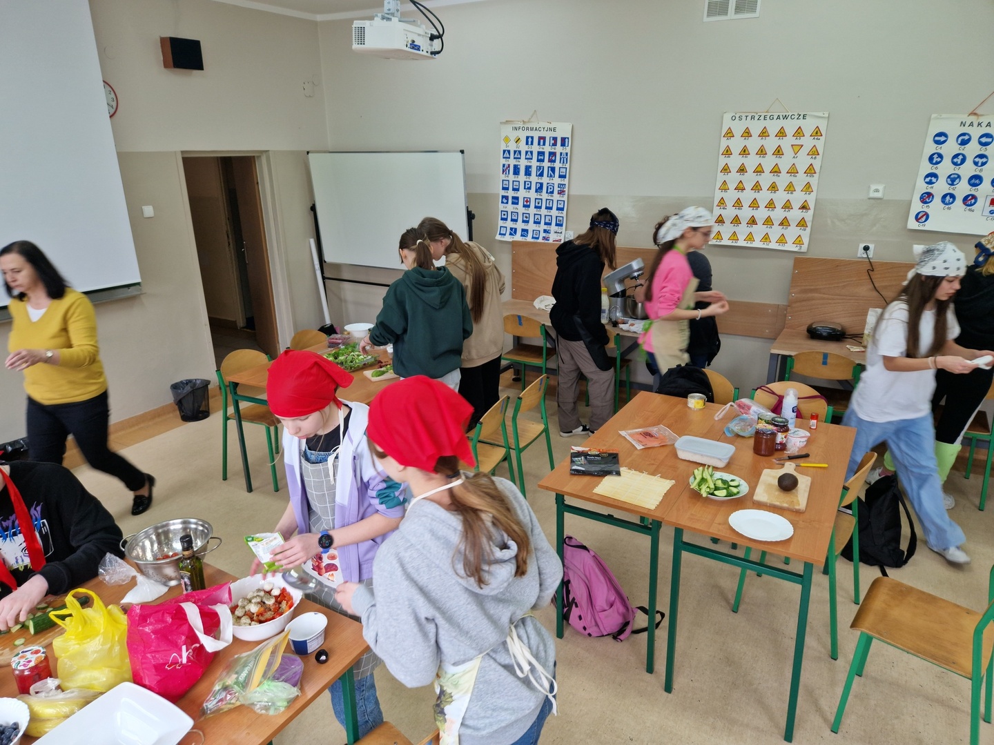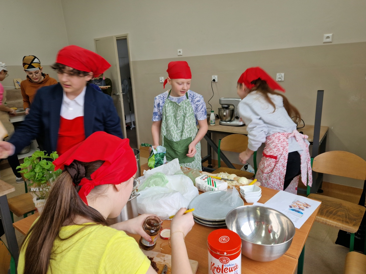 Dnia 21.03.2023r. z okazji DNIA WIOSNY uczniowie klas VII uczestniczyli w zajęciach kulinarnych. Nasi uczniowie w 5 i 6 – osobowych grupach przygotowali jabłka zapiekane z kruszonką, sushi, deser z jogurtu naturalnego, spaghetti, gofry, sałatki. Po przyrządzeniu potraw, wszyscy posprzątali swoje stanowiska pracy, a następnie usiedli do wspólnej degustacji. Dania były przepyszne i zniknęły szybciej niż się pojawiły na stole… Zapraszamy do obejrzenia zdjęć!!!
