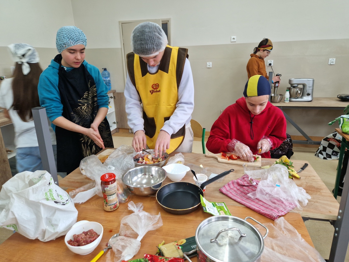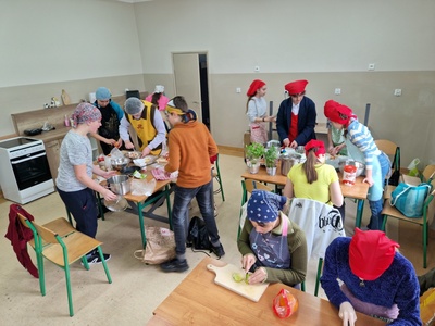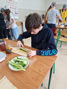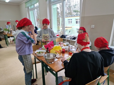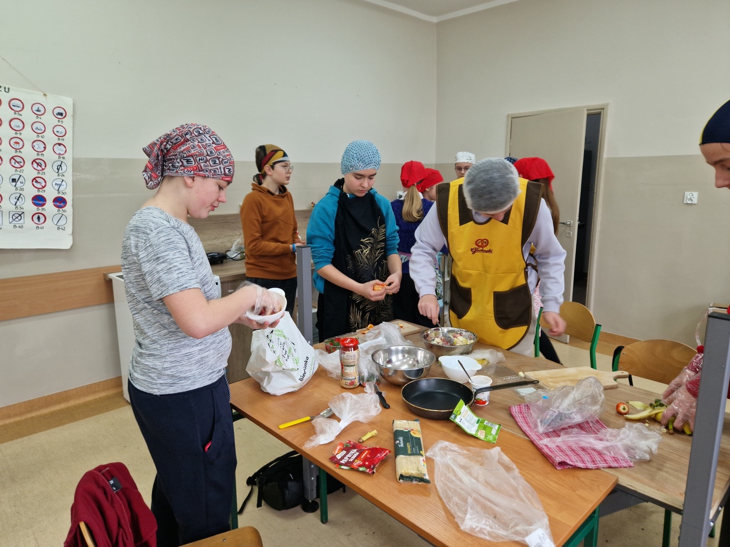 Dnia 21.03.2023r. z okazji DNIA WIOSNY uczniowie klas VII uczestniczyli w zajęciach kulinarnych. Nasi uczniowie w 5 i 6 – osobowych grupach przygotowali jabłka zapiekane z kruszonką, sushi, deser z jogurtu naturalnego, spaghetti, gofry, sałatki. Po przyrządzeniu potraw, wszyscy posprzątali swoje stanowiska pracy, a następnie usiedli do wspólnej degustacji. Dania były przepyszne i zniknęły szybciej niż się pojawiły na stole… Zapraszamy do obejrzenia zdjęć!!!