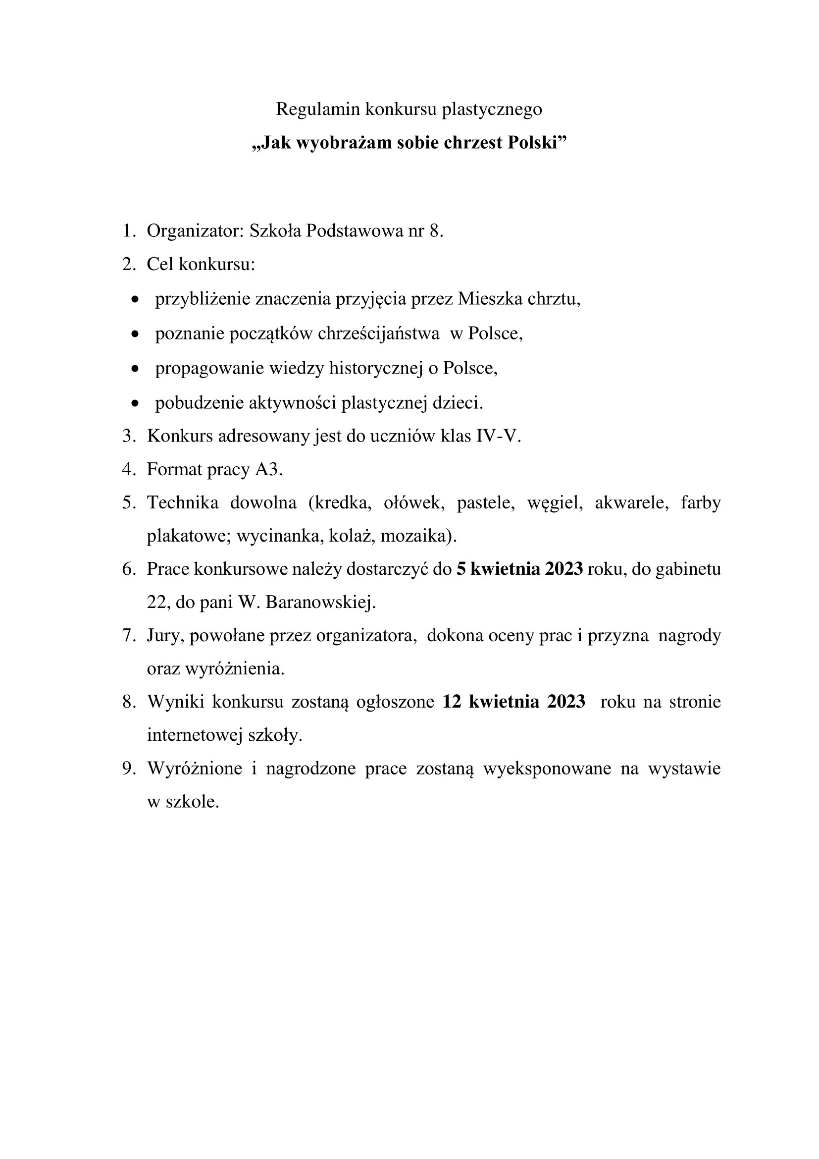 Konkurs Załączniki Jak wyobrażam sobie chrzest Polski jpg [438.72 kB] Regulamin [256.30 kB] Powiązane wiadomości Konkurs ortograficzny Zajęcia kulinarne Pierwszy dzień wiosny w klasie Va i Vd Konkurs Dzień Św. Patryka Powitanie wiosny w kl. IIa Drukuj Udostępnij Data dodania: 22.03.2023 Wyświetlono: 65 Aktualności