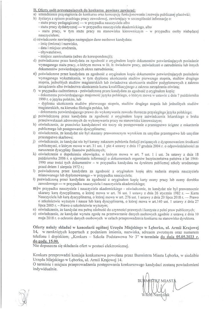 Burmistrz Miasta Lęborka ogłasza konkurs na kandydata na stanowisko dyrektora Szkoły Podstawowej nr 3 w Lęborku.