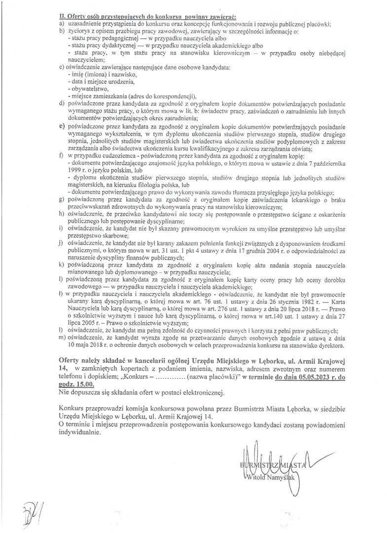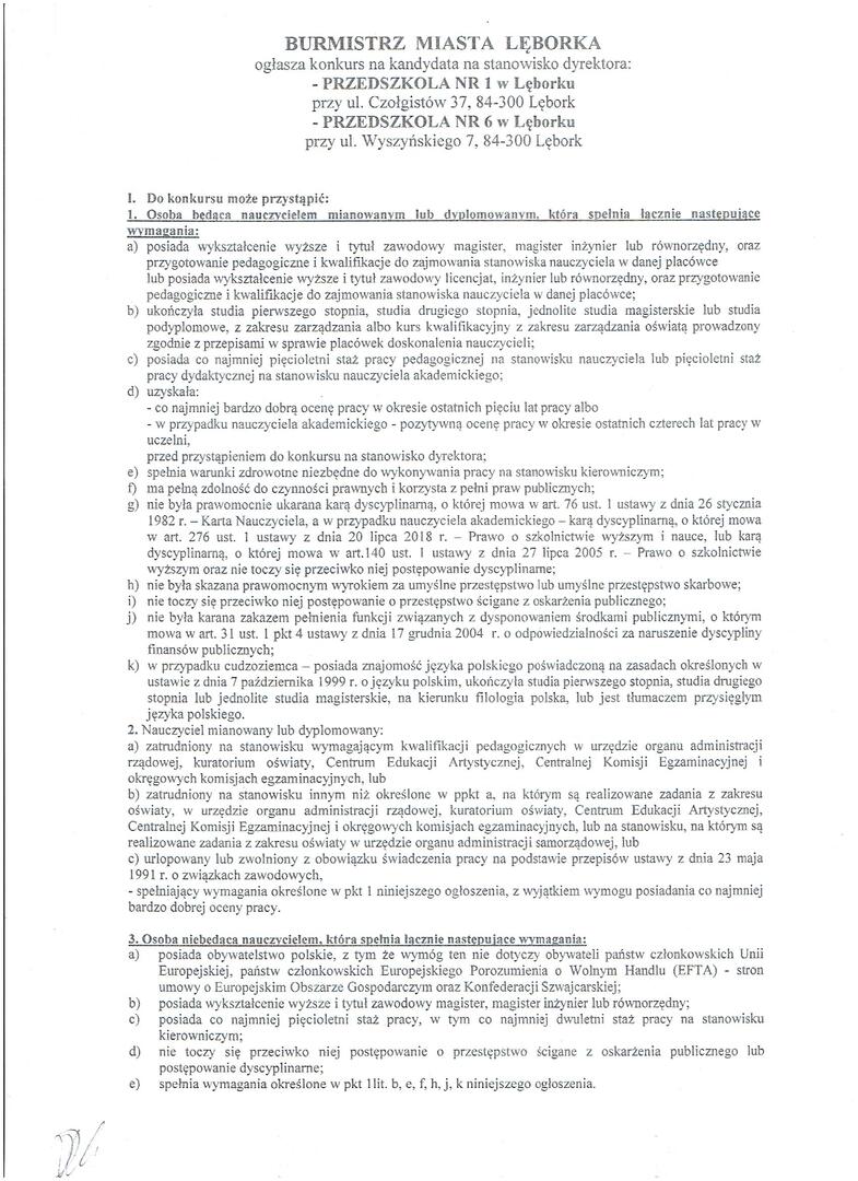 Burmistrz Miasta Lęborka ogłasza konkurs na kandydata na stanowisko dyrektora Przedszkola nr 1 w Lęborku oraz Przedszkolna nr 6 w Lęborku.