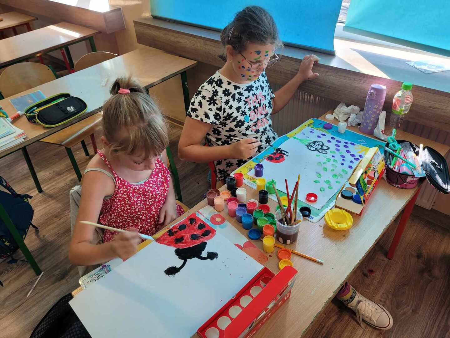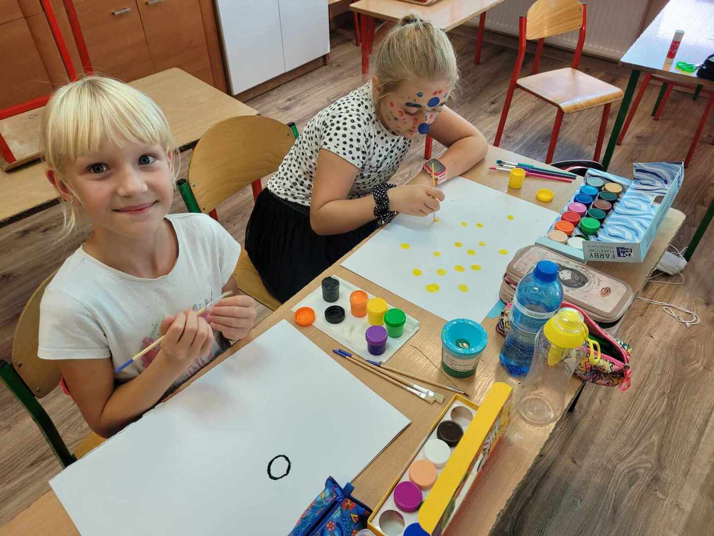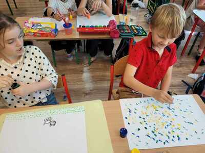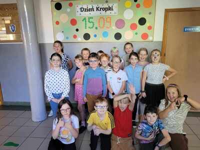 Uczniowie klasy III c na początku zajęć zaangażowani byli w kropkowe karty ruchowe i chętnie wykonywali zabawne polecenia. Następnie obejrzeli krótki film o dziewczynce Vashti, jest ona bohaterką książki Petera Reynoldsa pt. "Kropka". Skorzystali również z gościnności p. Eweliny Jankowskiej i udali się do świetlicy w celu umalowania swoich buziek i wykonania pamiątkowych zdjęć. Na koniec każdy mógł wyrazić swój talent plastyczny i namalować kropkowe dzieło.