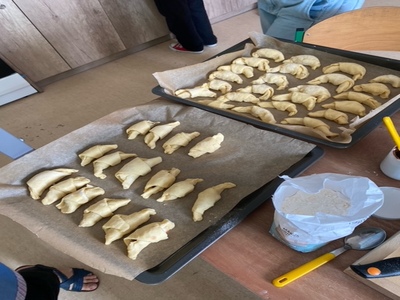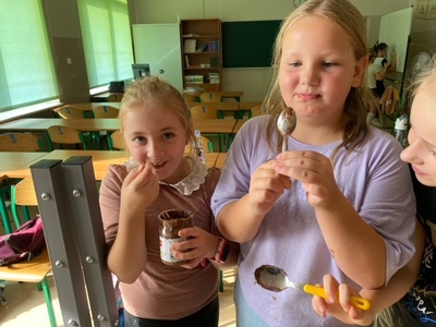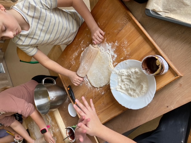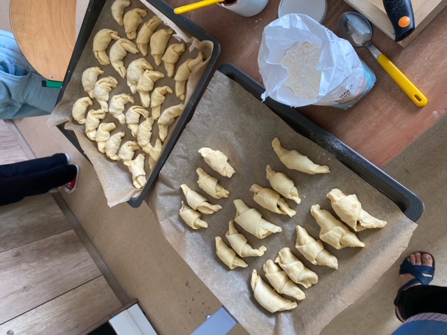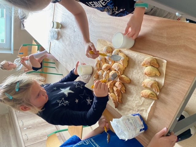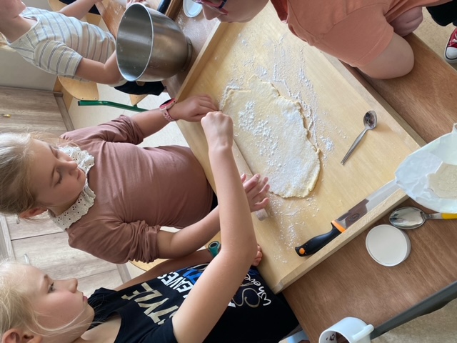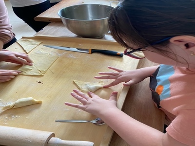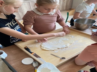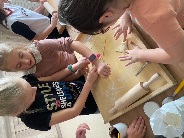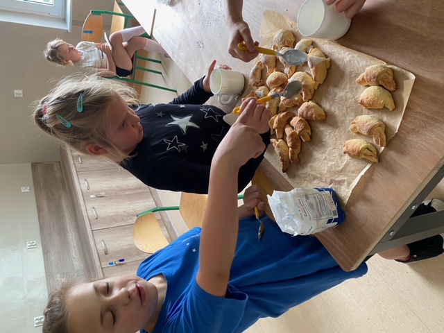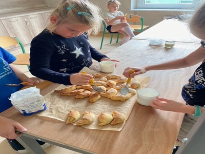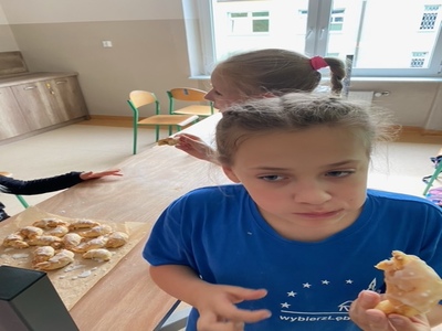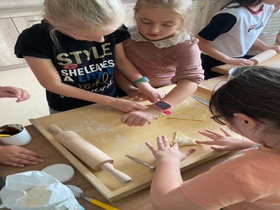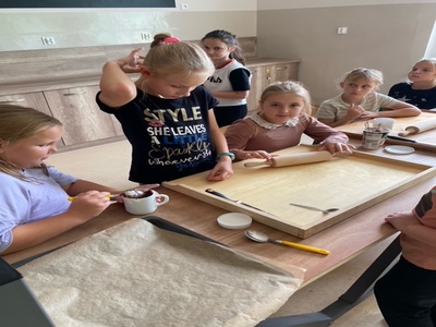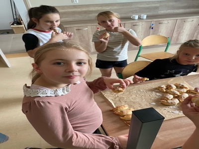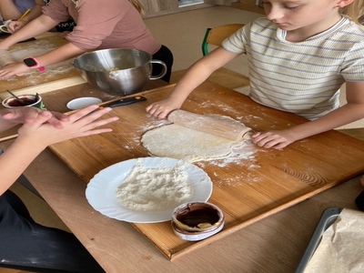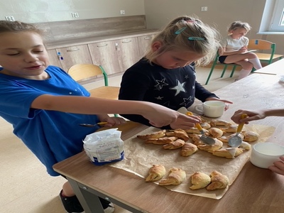 Za nami pierwsze spotkanie pozalekcyjne - zajęcia kulinarne, na których upiekliśmy rogaliki krucho-drożdżowe. Dzieciaki super się spisały. Wyszły nam naprawdę apetyczne i smaczne rogaliki nadziewane marmoladą i czekoladą do wyboru. Każdy uczestnik zajęć musiał formować rogaliki i - jak się okazało - nawet wszystkim to wychodziło. Było przy tym sporo radości i zabawy.