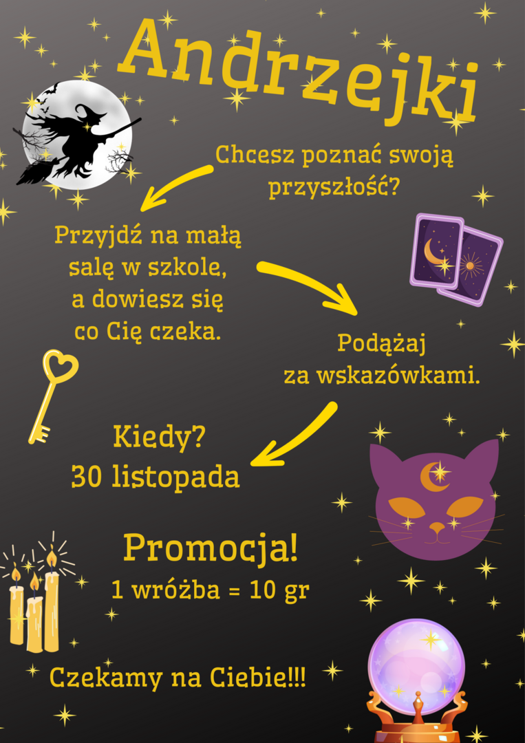 Andrzejki Galeria zdjęć Powiązane wiadomości JESIENNY POKAZ MODY W ŚWIETLICY UWAGA! UWAGA! Dzień Szalonego Kapcia! Andrzejki Rajd Magia Wielkiej Fabryki Elfów Drukuj Udostępnij Data dodania: 26.11.2023 Wyświetlono: 75 Aktualności