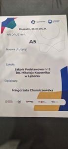 25 listopada 2023r. w Koszalinie odbył się etap Wojewódzkiego Ogólnopolskiego Turnieju Ligi Robotów. Zdaniem drużyny było: zaprojektowane, skonstruowanie robota, zbudowanie pojazdu napędzanego gumką. Uczniom udało się zająć I miejsce w kategorii wyścig robota.