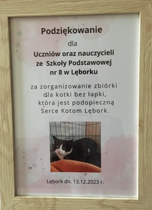 Podziękowanie Dziś wpłynęło do naszej szkoły podziękowanie dla całej społeczności szkolnej za zebranie funduszy na rehabilitację i leczenie Kotki bez łapki.Zebrano 546 złBardzo dziękujemy za wrażliwość na krzywdę i cierpienie zwierząt. Galeria zdjęć Powiązane wiadomości Turniej sportowy Kiermasz Kopciuszek Podziękowanie Świąteczne dekorowanie pierników Drzewko szczęścia dzieci z klasy 3D Drukuj Udostępnij Data dodania: 15.12.2023 Wyświetlono: 129 Aktualności