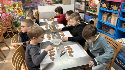 W ramach przedświątecznych przygotowań uczniowie klasy 2 c wybrali się do lęborskiego muzeum, by móc uczestniczyć w warsztatach dekorowania pierników. Celem warsztatów było przybliżenie tradycji i zwyczajów świątecznych, ukazanie piękna Świąt Bożego Narodzenia oraz zachęcenie do samodzielnego dekorowanie pierników. Pierniczki były malowane polewą lukrową, a następnie ozdabiane kolorowymi posypkami. Efekty swojej pracy można było zabrać do domu, aby zawiesić na choince. Takie aktywności sprawiły dzieciom wiele miłych i atrakcyjnych przeżyć. Dekorowanie pięknie pachnących pierniczków okazało się świetną i twórczą zabawą.
