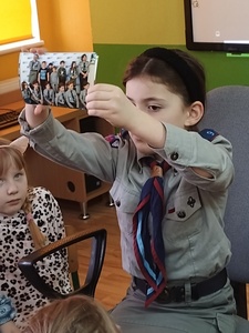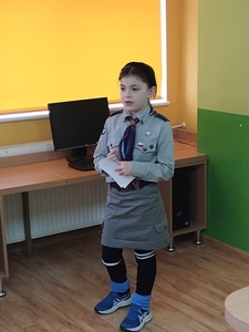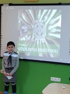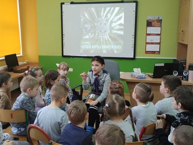 Z tej okazji uczennica klasy I A, nasz zuch Ewa Jankowska, przyszła do szkoły w mundurku i pięknie opowiadała o zbiórkach zuchowych, o harcerskich akcjach, biwakach i obozach. Ewa pokazała dzieciom wiele zdjęć, zachęcając jednocześnie koleżanki i kolegów do rozpoczęcia przygody z harcerstwem.
