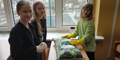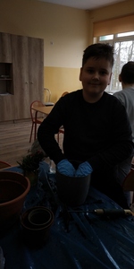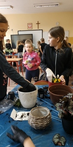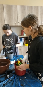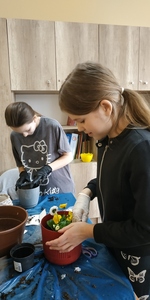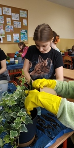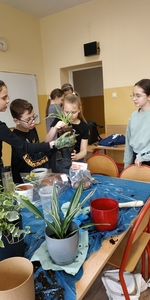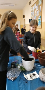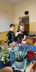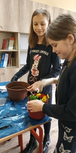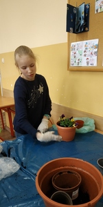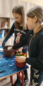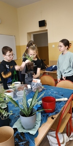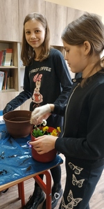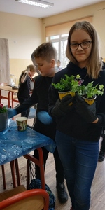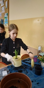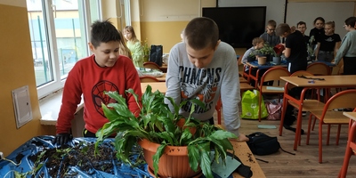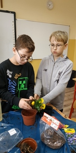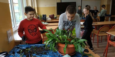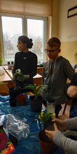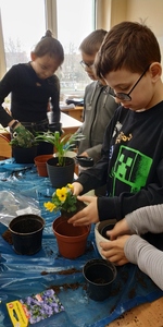 Uczniowie klas czwartych witali wiosnę w nietypowy sposób. Sami zadbali o kwiaty w swoim najbliższym otoczeniu. Przesadzali rośliny i siali nasionka kwiatów. Dzięki dzisiejszej pracy sale lekcyjne będą radośniejsze i bardziej kolorowe.