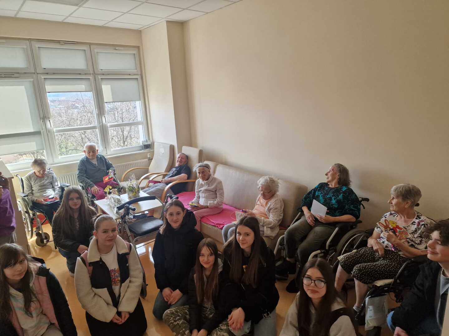 Przed Świętami Wielkanocnymi uczniowie z Szkolnego Koła Wolontariackiego SP8 odwiedzili Pensjonariuszy Zakładu Pielęgnacyjno-Opiekuńczego w lęborskim szpitalu. Wolontariusze złożyli serdeczne życzenia Seniorom oraz obdarowali drobnymi upominkami i kartkami wykonanymi przez uczniów klas 5c i 5d. Właśnie takie chwile sprawiają, że warto angażować się w działania wolontariackie, by móc przynosić radość innym i czynić ich życie choć trochę piękniejszym.