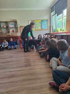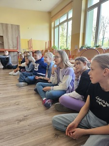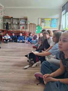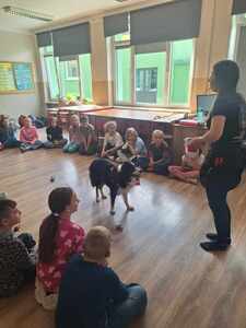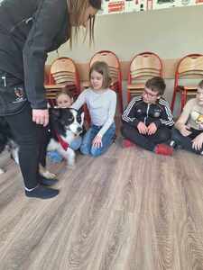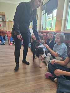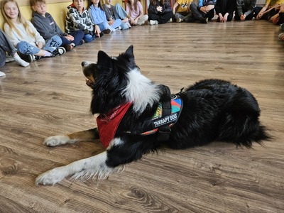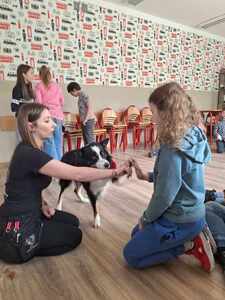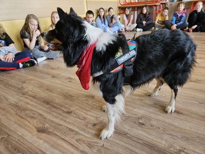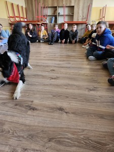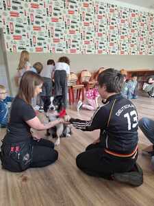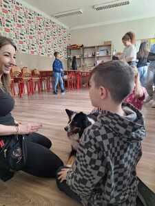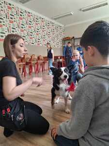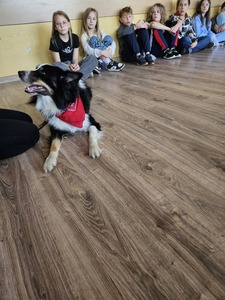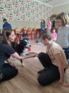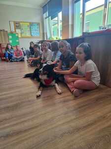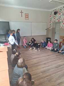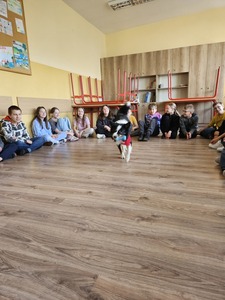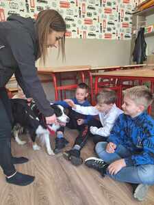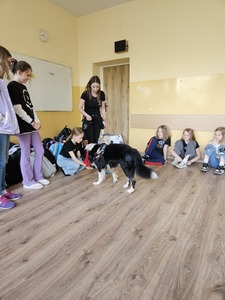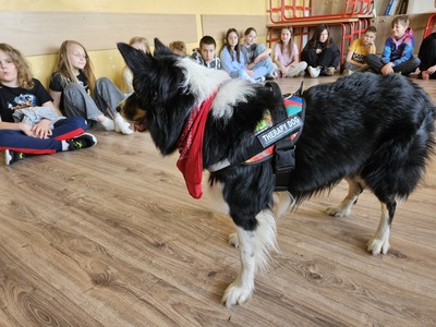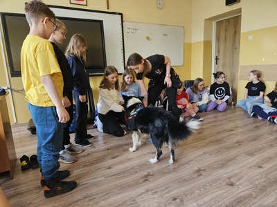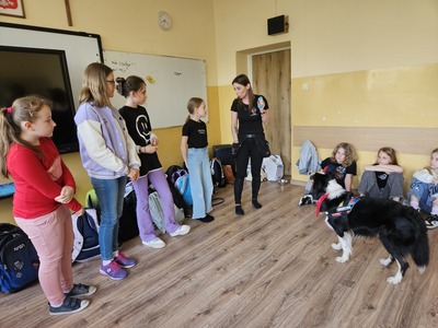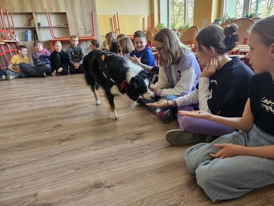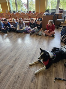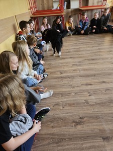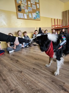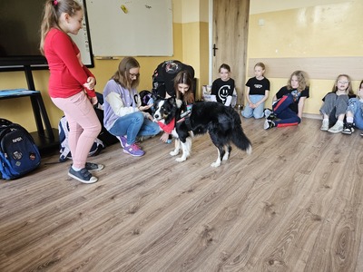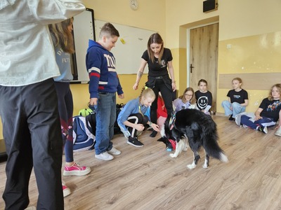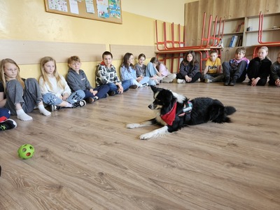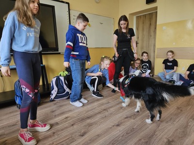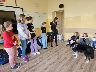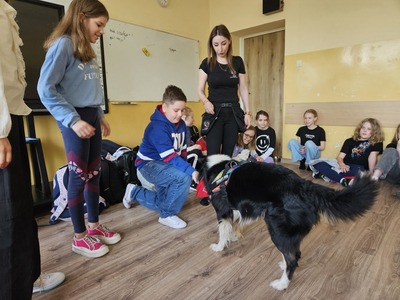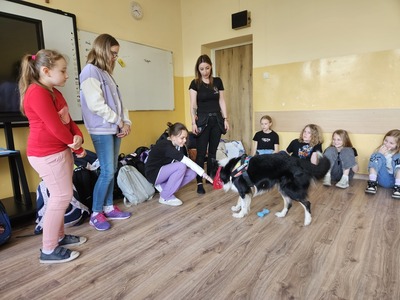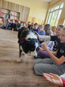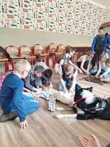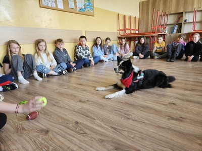 Uczniowie kl. IVa oraz IVb wzięli udział w warsztatach z psem. Sympatycznym gościem okazał się border collie o imieniu Chilli, który przyszedł razem ze swoją opiekunką Panią Pauliną. Podczas spotkania uczniowie poszerzyli swoją wiedzę na temat właściwych relacji opiekun-pies. Dowiedzieli się, jak traktować czworonoga, jak się nim opiekować, wychowywać go. Poznali zasady postępowania w przypadku kontaktu z nieznanym psem. Zajęcia wyzwoliły w uczestnikach wiele pozytywnych emocji, gdyż Chilli udowodnił, że jest niezwykle posłuszny, inteligentny i sympatyczny. Nie dziwi zatem fakt, że szybko zdobył wielką sympatię czwartoklasistów.