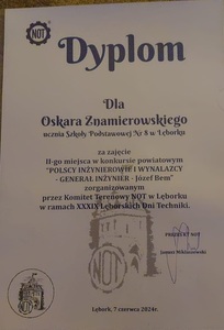 Komitet Terenowy NOT w Lęborku w ramach obchodów XXXIX Lęborskich Dni Techniki zorganizował konkurs dla uczniów szkół podstawowych, którego tematem był „Życiorys i dokonania Józefa Bema”. Galę rozdania nagród uświetnił wykład przygotowany przez organizatorów na temat życia i osiągnięć wybitnego generała i inżyniera. Naszą szkołę reprezentował Oskar Znamierowski z klasy 8B, który zajął 2 miejsce!