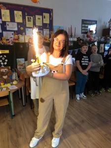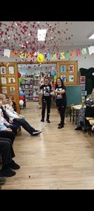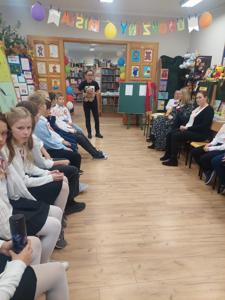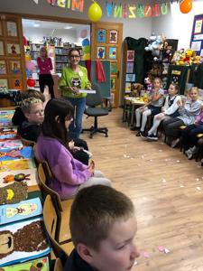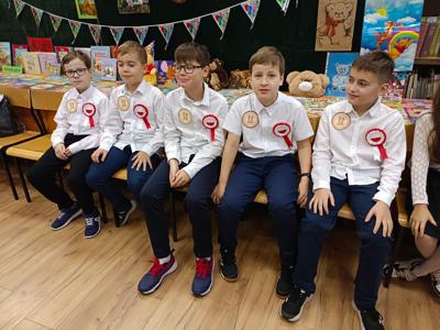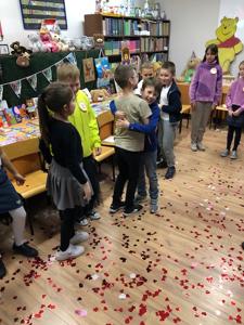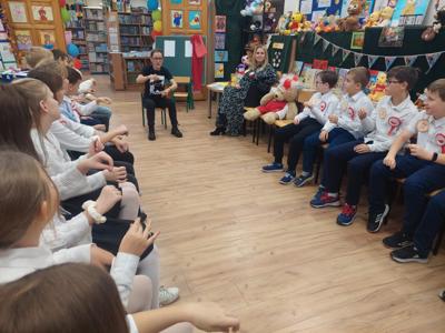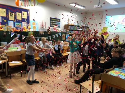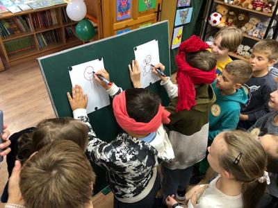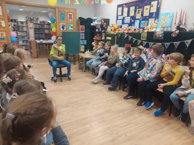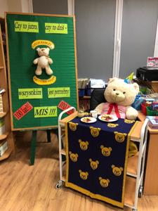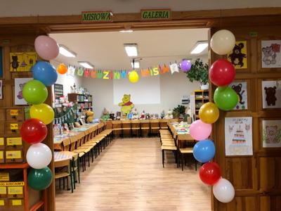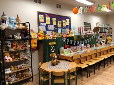 W październiku miś obchodzi swoje urodziny. Z tej okazji biblioteka szkolna zaprosiła wyjątkowych gości - uczniów klas trzecich i czwartych na urodzinową imprezę. Dzieci przygotowywały się do niej długo i solidnie - wykonały bardzo oryginalne prezenty dla naszego jubilata. Powstały piękne portrety znanych misiów - Uszatka, Puchatka, Yogi i innych. Nie zabrakło tortów, zakładek do książek... Biblioteka zamieniła się w magiczną "misiową" salę pełną pluszaków i różnych gadżetów z wizerunkiem misia. Każdy gość już przy wejściu otrzymał odznakę z wizerunkiem bohatera dnia. Po wręczeniu misiowi prezentów, odśpiewaniu "Sto lat" i celebracji tortu z iskrzącą fontanną, dzieci poznały historię maskotki – pluszowego misia, Uszatka, Colargola, Paddingtona, misia Yogi i innych. Były również fragmenty kultowych dobranocek z dawnych czasów. Goście poznali również postać Misia Wojtka, służącego w czasie II wojny światowej w Armii Andersa. Zainteresowała ich postać niedźwiadka, który nosił amunicję, bawił się w zapasy z żołnierzami i spał z nimi w jednym namiocie...