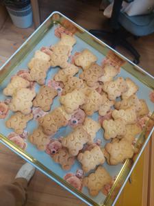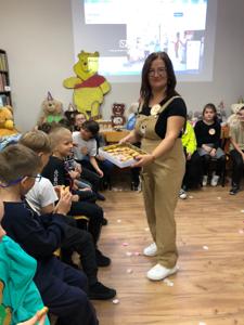 Jak urodziny, to również zabawa... dlatego też panie bibliotekarki przygotowały ciekawe konkursy, m.in. malowanie misia z zawiązanymi oczami, wyścigi w zlizywaniu miodku ze spodka, skoki kangurka, przyczepianie ogonka Kłapouchemu. Dzieci "upiekły" również ciasteczka w kształcie pięknych misiaczków, które wszystkim gościom bardzo smakowały. Przepis na ciasteczka podpowiedziała piosenka "Pieczemy ciasto", przy której wszyscy świetnie się bawili. Nie zabrakło również confetti i tańców :)