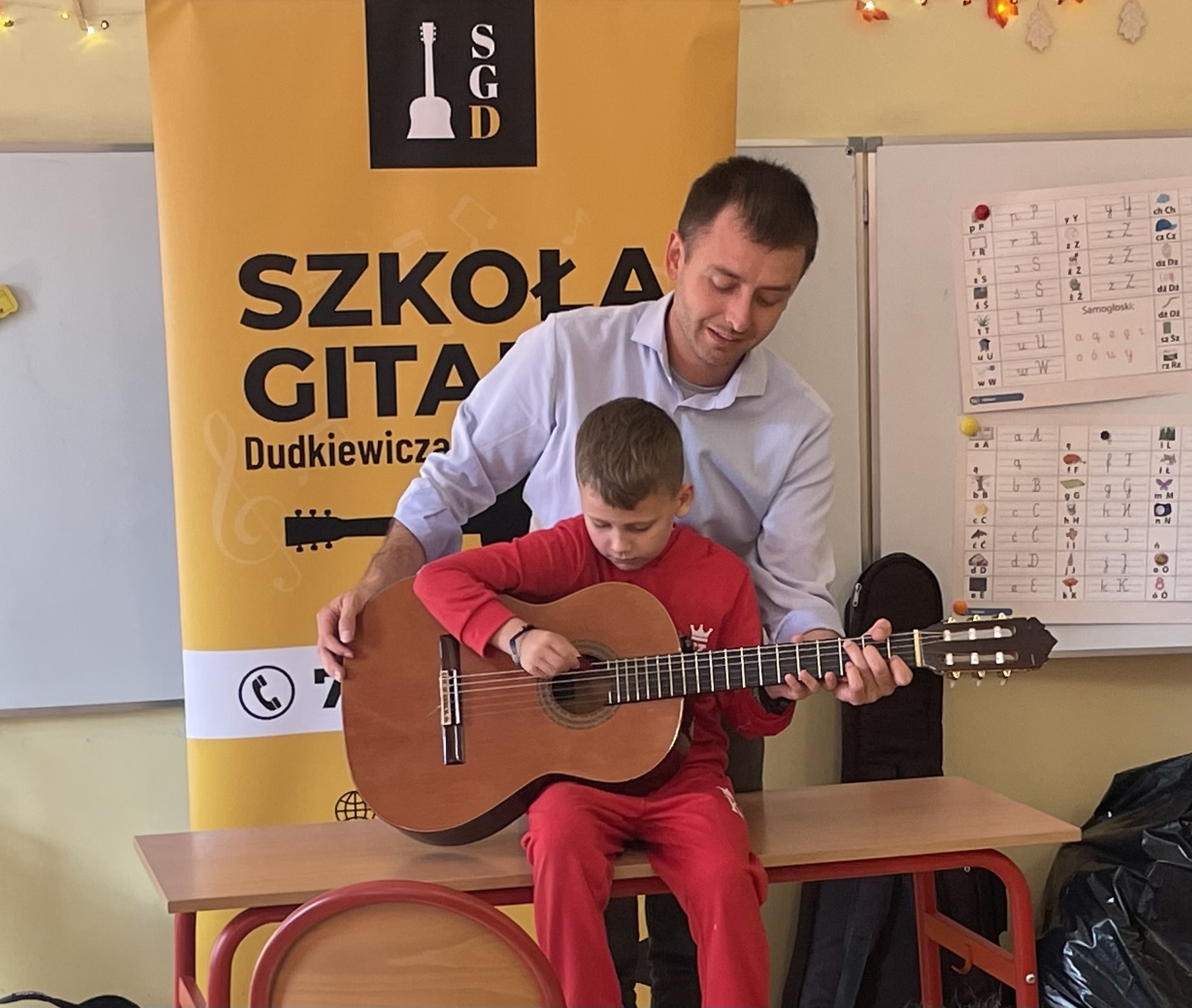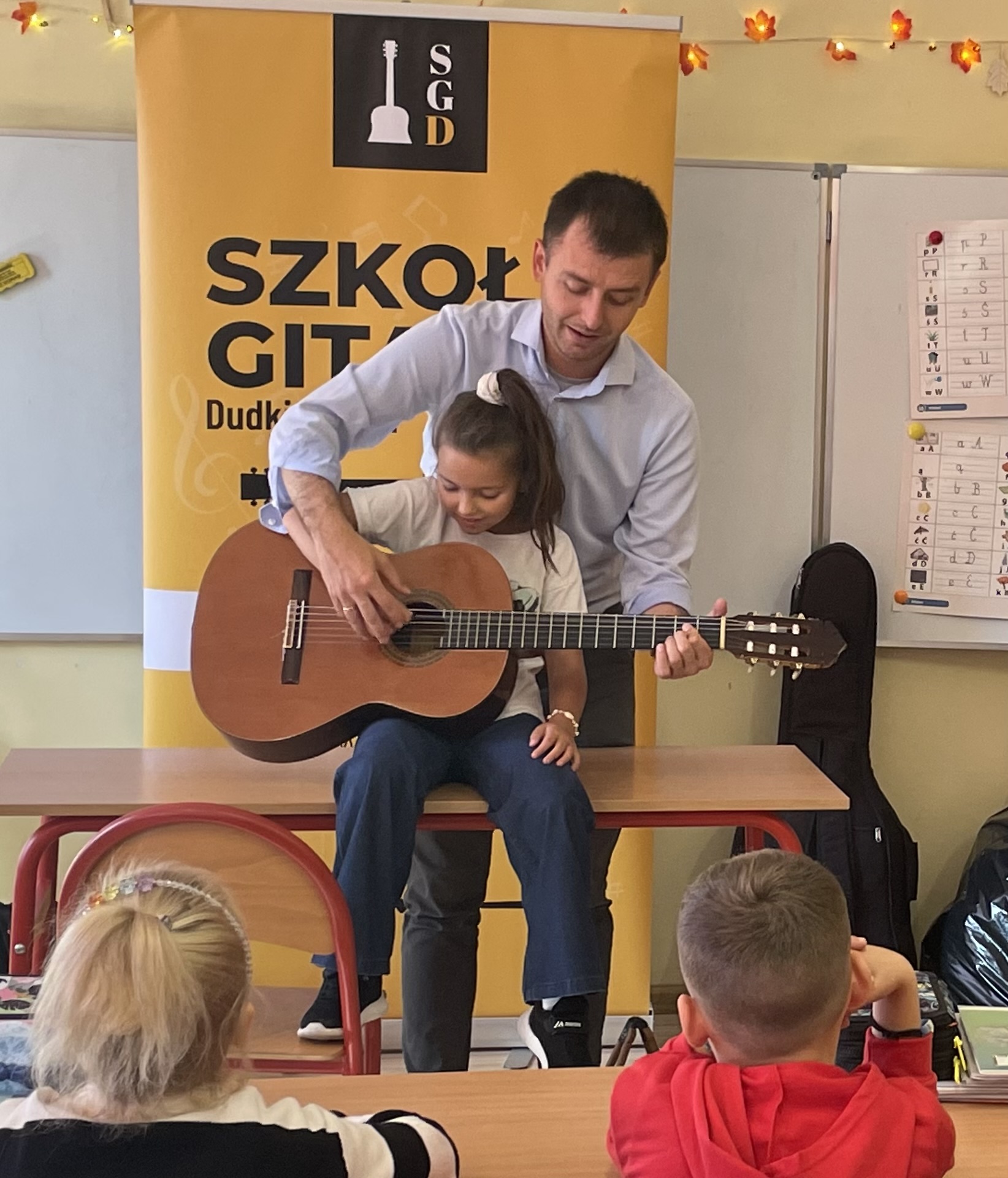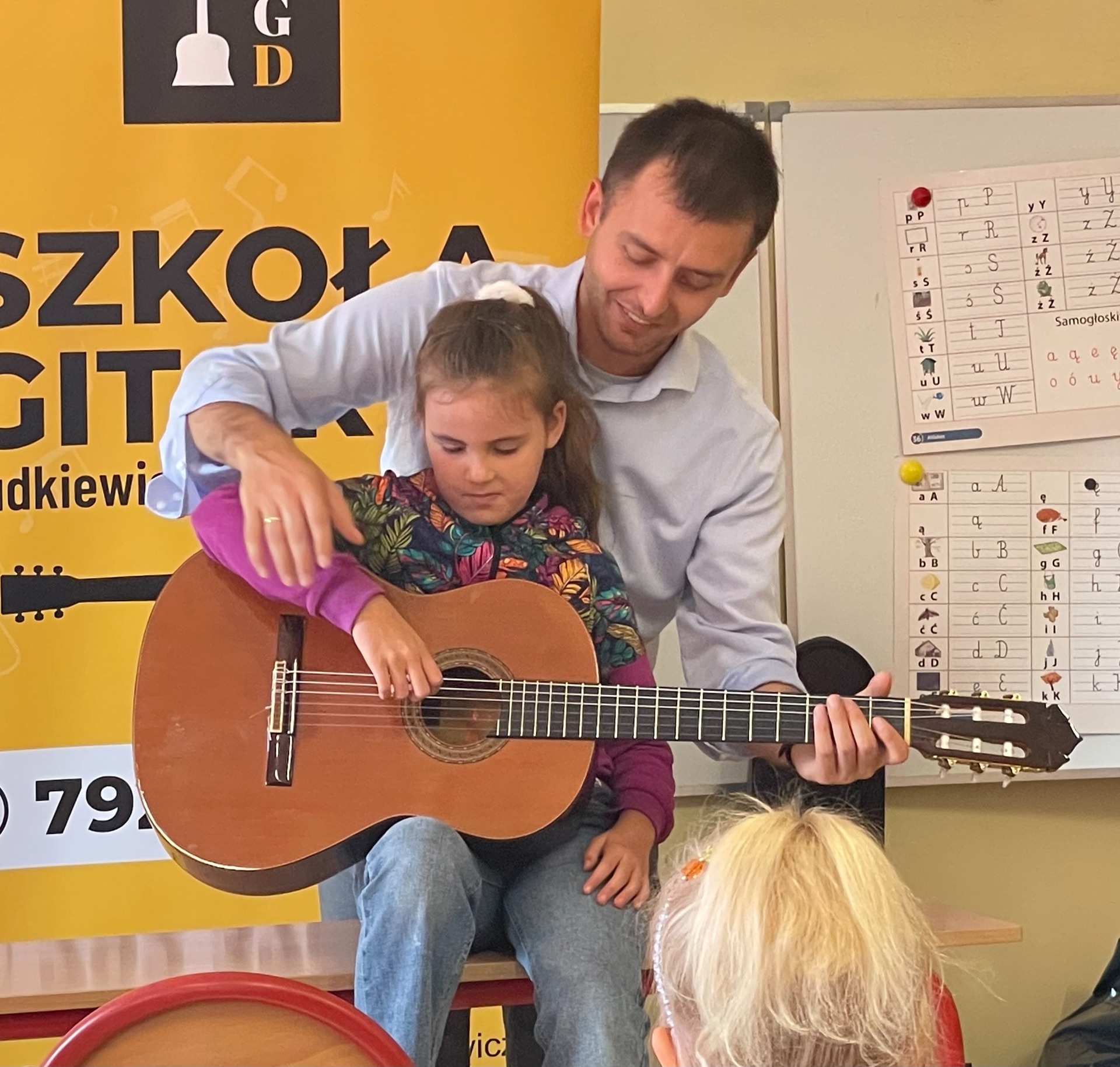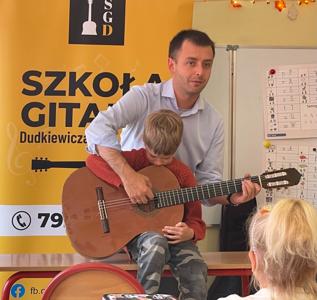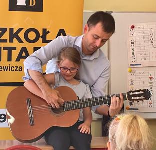 Dzieci z klasy 2b uczestniczyły w niezwykłej lekcji muzyki. Pan Mikołaj Dudkiewicz zaprezentował grę na gitarze. Dzieci miały okazję spróbować swoich sił i przy pomocy muzyka wspólnie zgrać na gitarze. To było bardzo ciekawe doświadczenie.