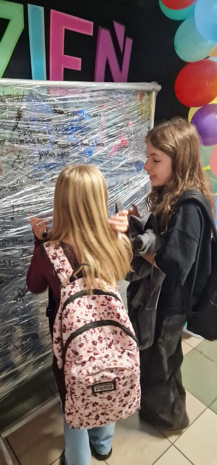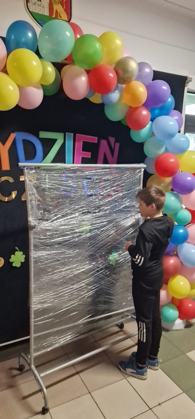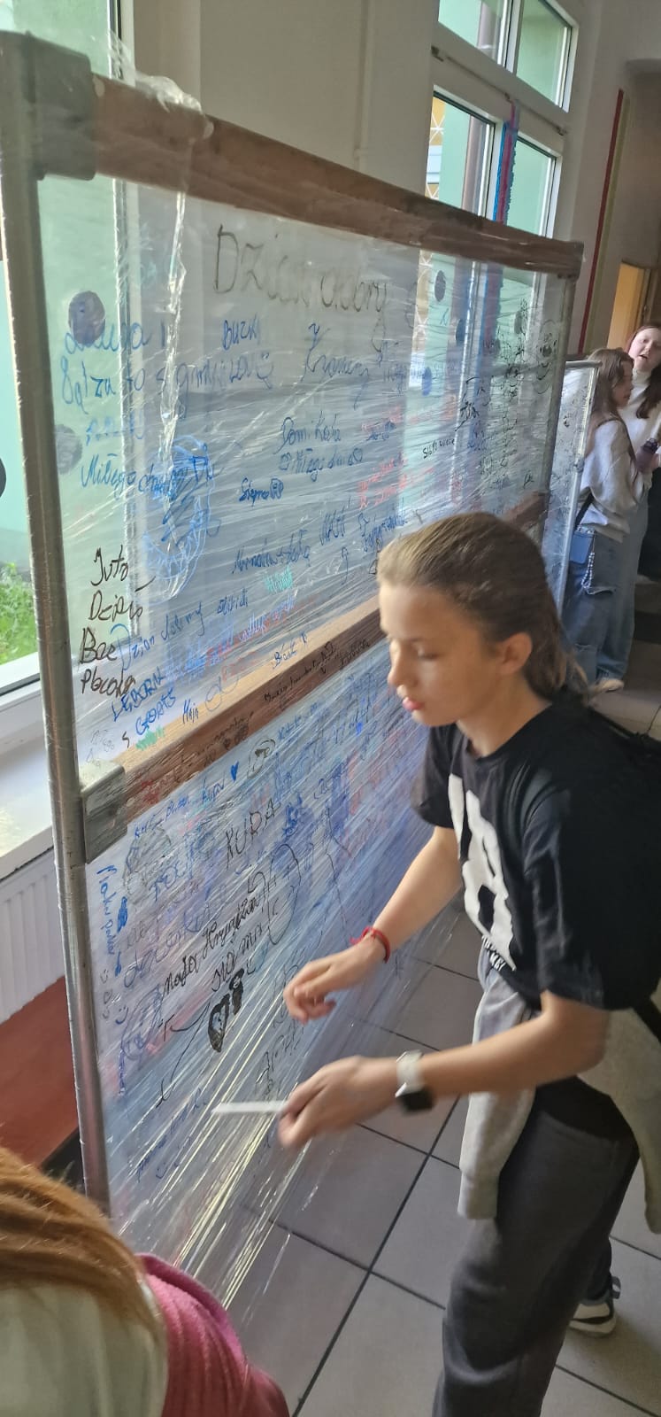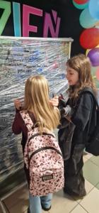 Tego dnia uczniowie zapisywali markerami na rozciągniętej folii stretch swoje pozytywne myśli, miłe słowa i pozdrowienia dla innych.