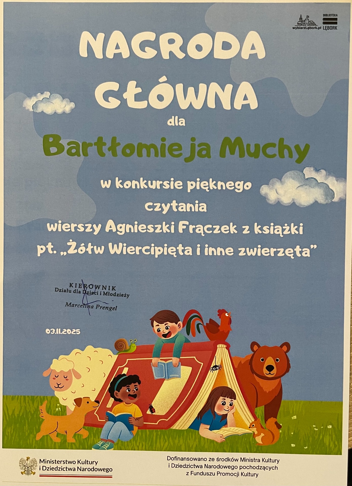 Uczniowie klasy 2b wzięli udział w Konkursie pięknego czytania wierszy Agnieszki Frączek organizowanym przez Bibliotekę Miejską w Lęborku. Sześcioro uczniów z klasy 2b znalazło się w gronie nagrodzonych. Oto oni: