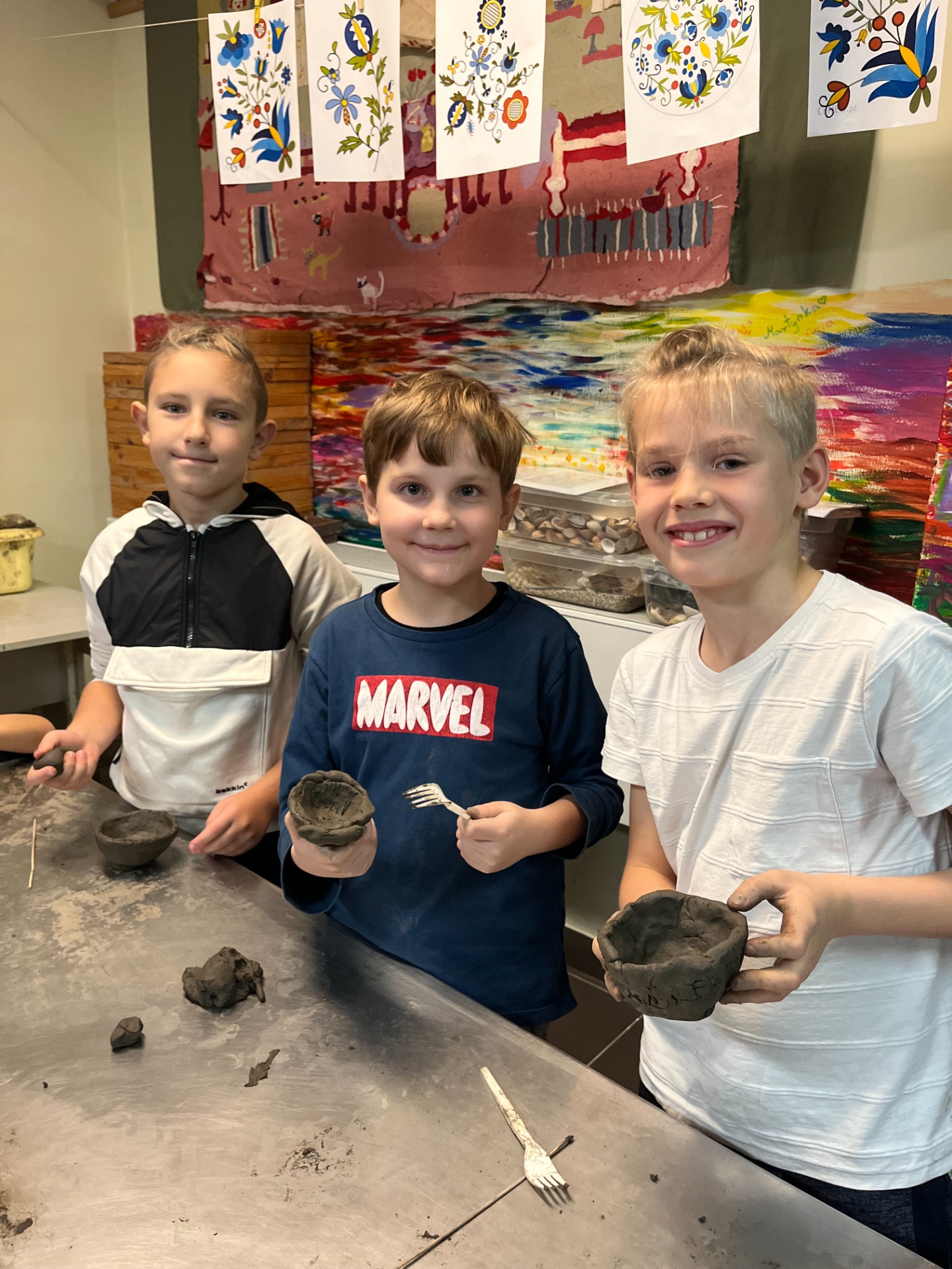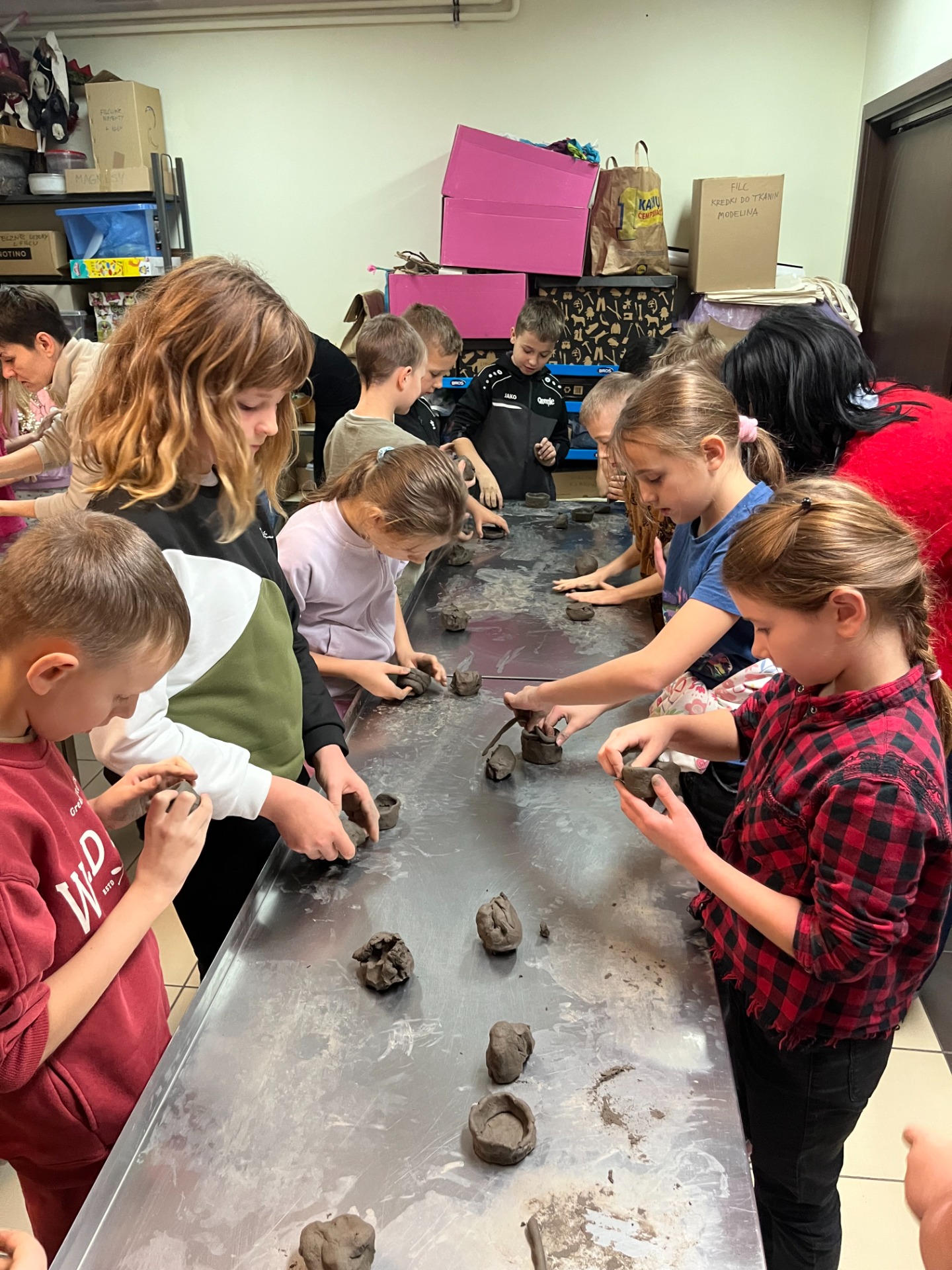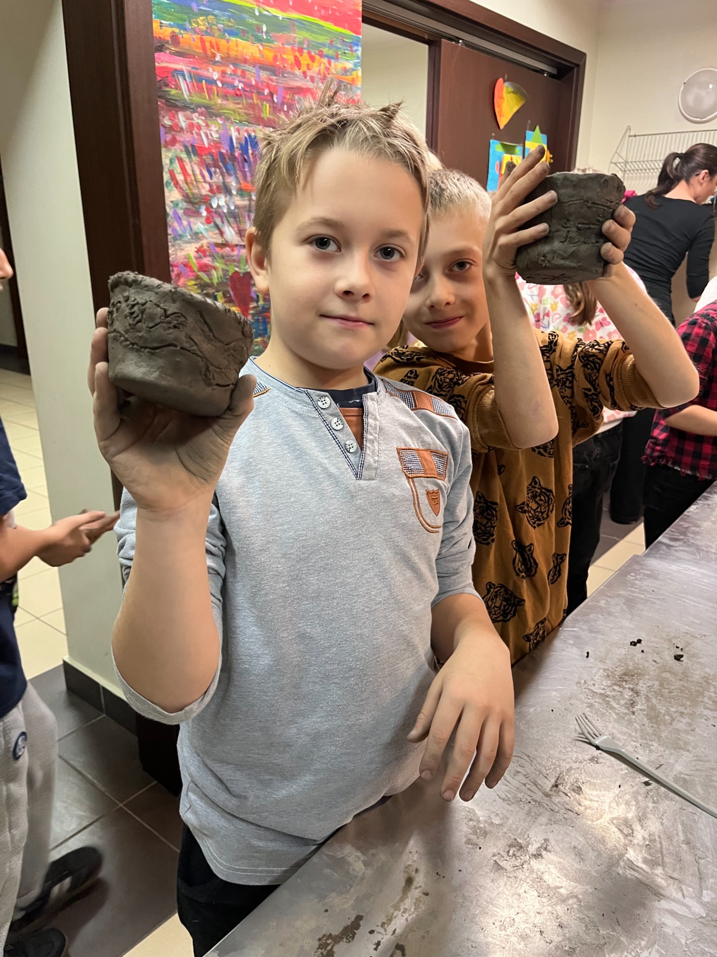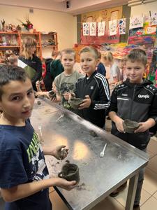 Podczas zajęć dzieci poznały proces powstawania glinianych naczyń. W drugiej części spotkania uczniowie samodzielnie wykonali swoje prace z gliny, rozwijając zdolności manualne i kreatywność.