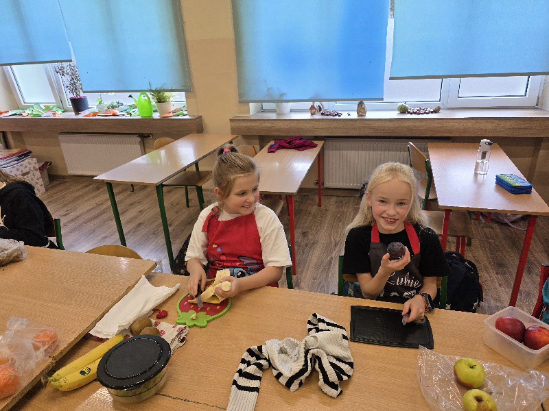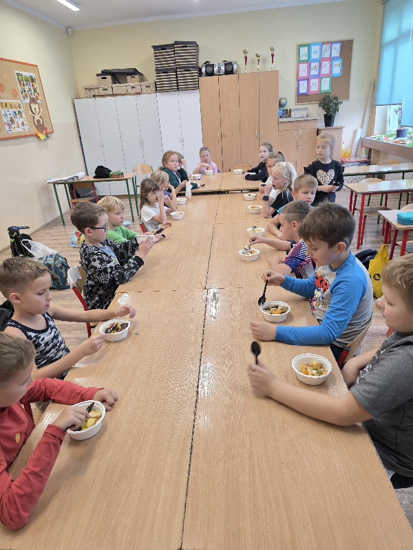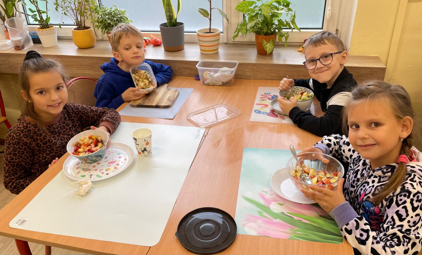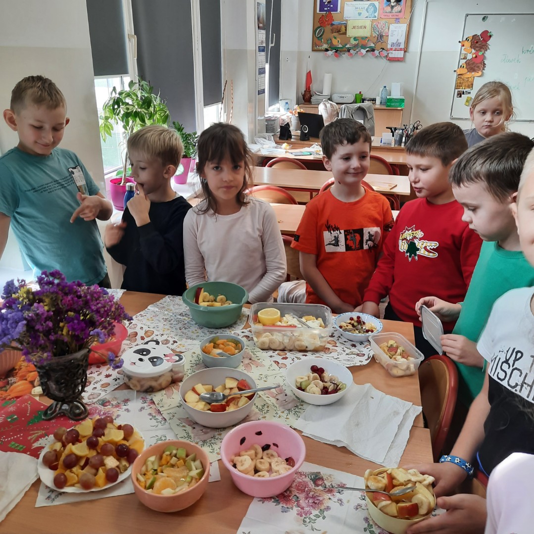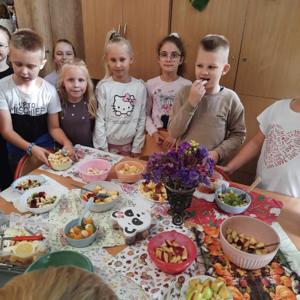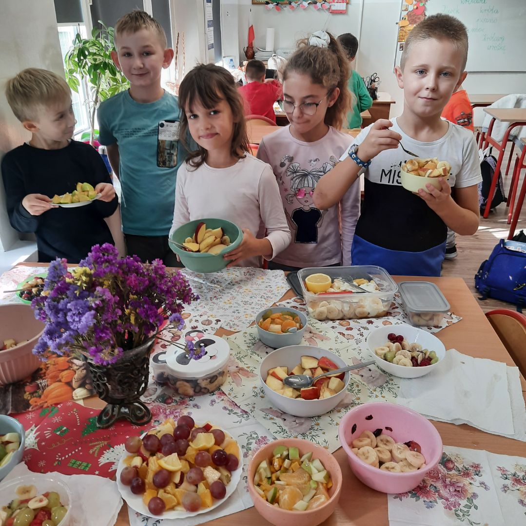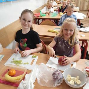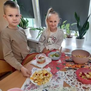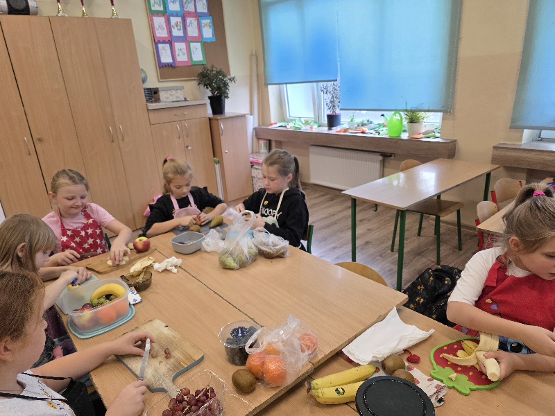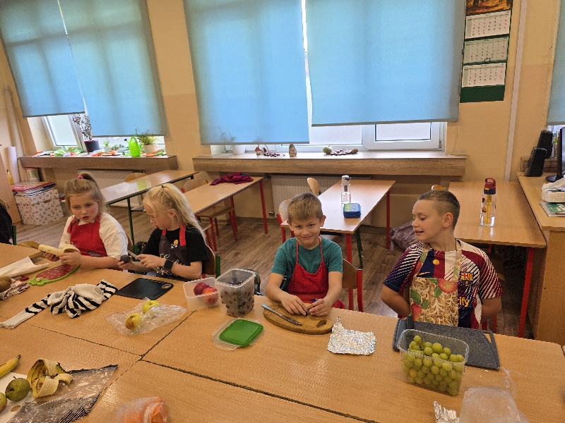 Wspólne krojenie, mieszanie i degustowanie przyniosło uczniom mnóstwo radości, a zapach świeżych owoców i warzyw długo unosił się w szkolnej sali.