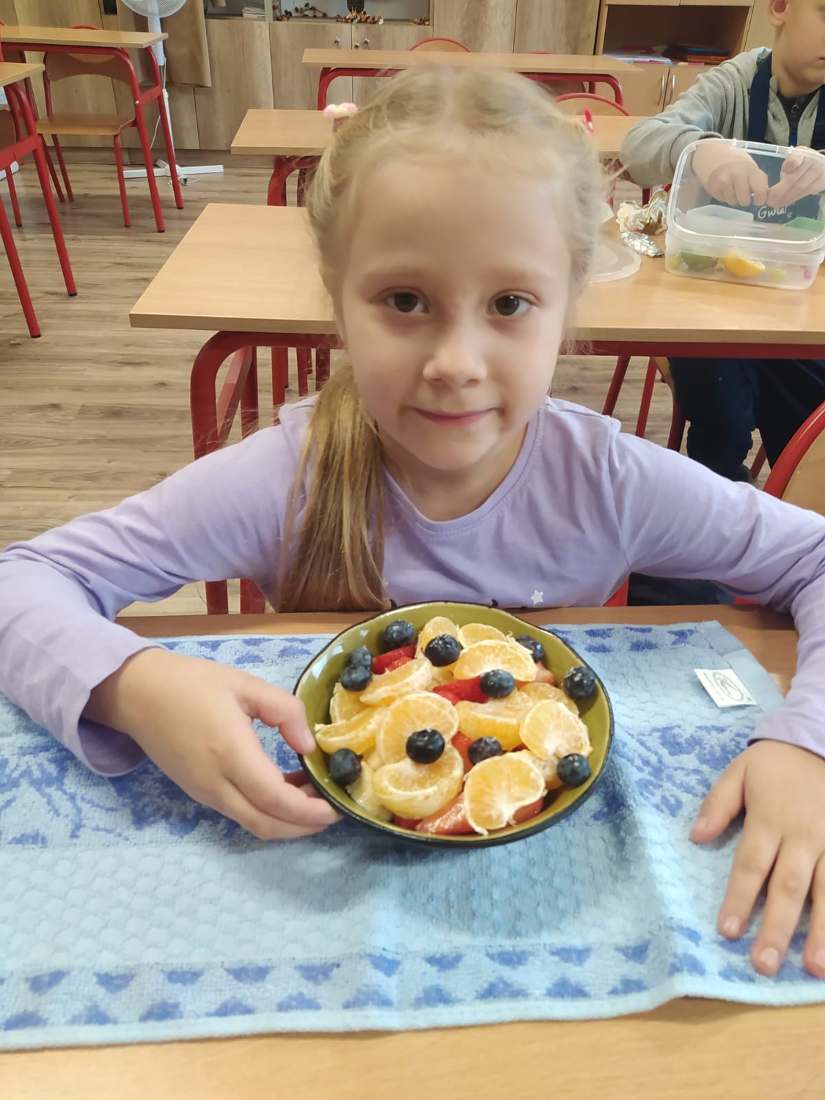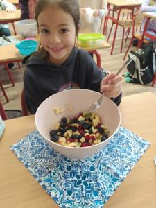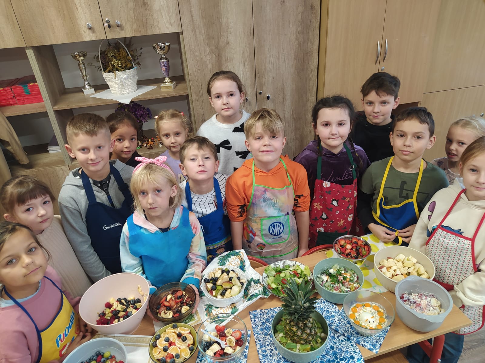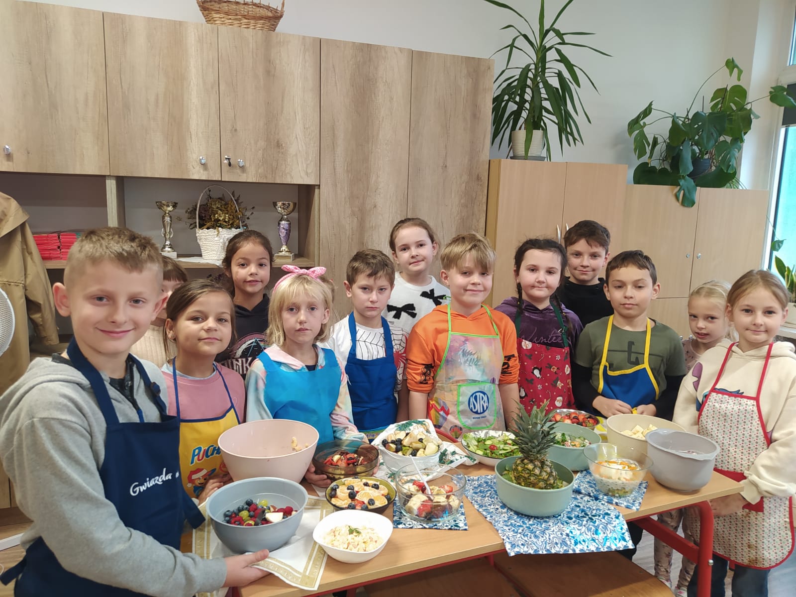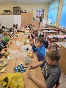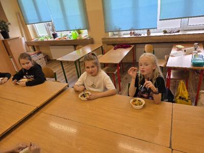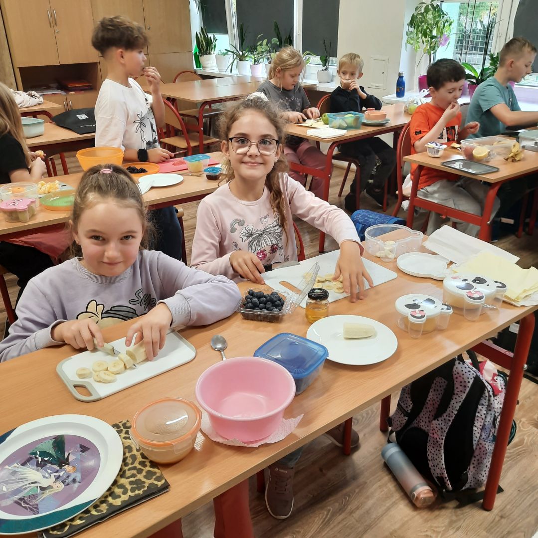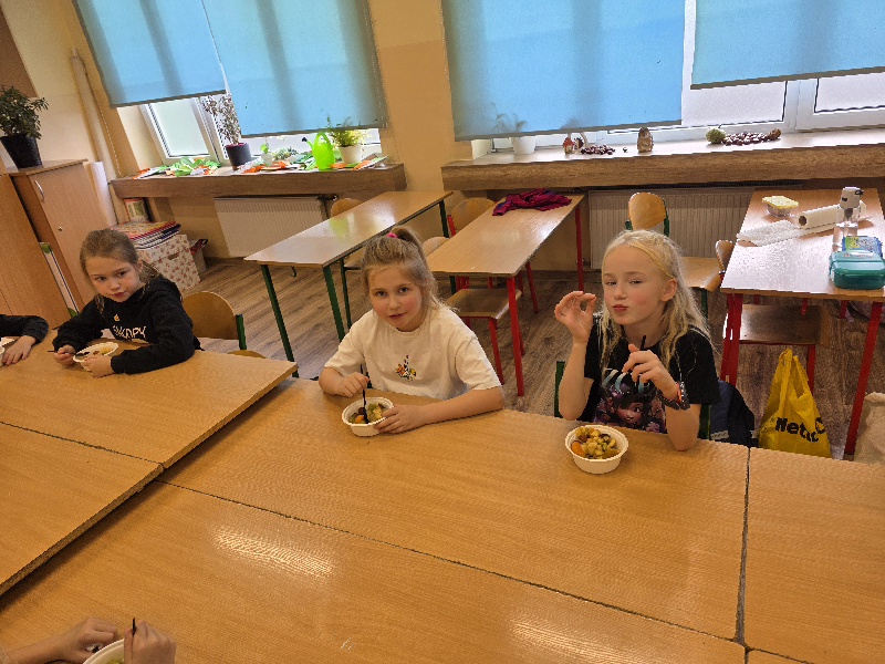 Wspólne krojenie, mieszanie i degustowanie przyniosło uczniom mnóstwo radości, a zapach świeżych owoców i warzyw długo unosił się w szkolnej sali.