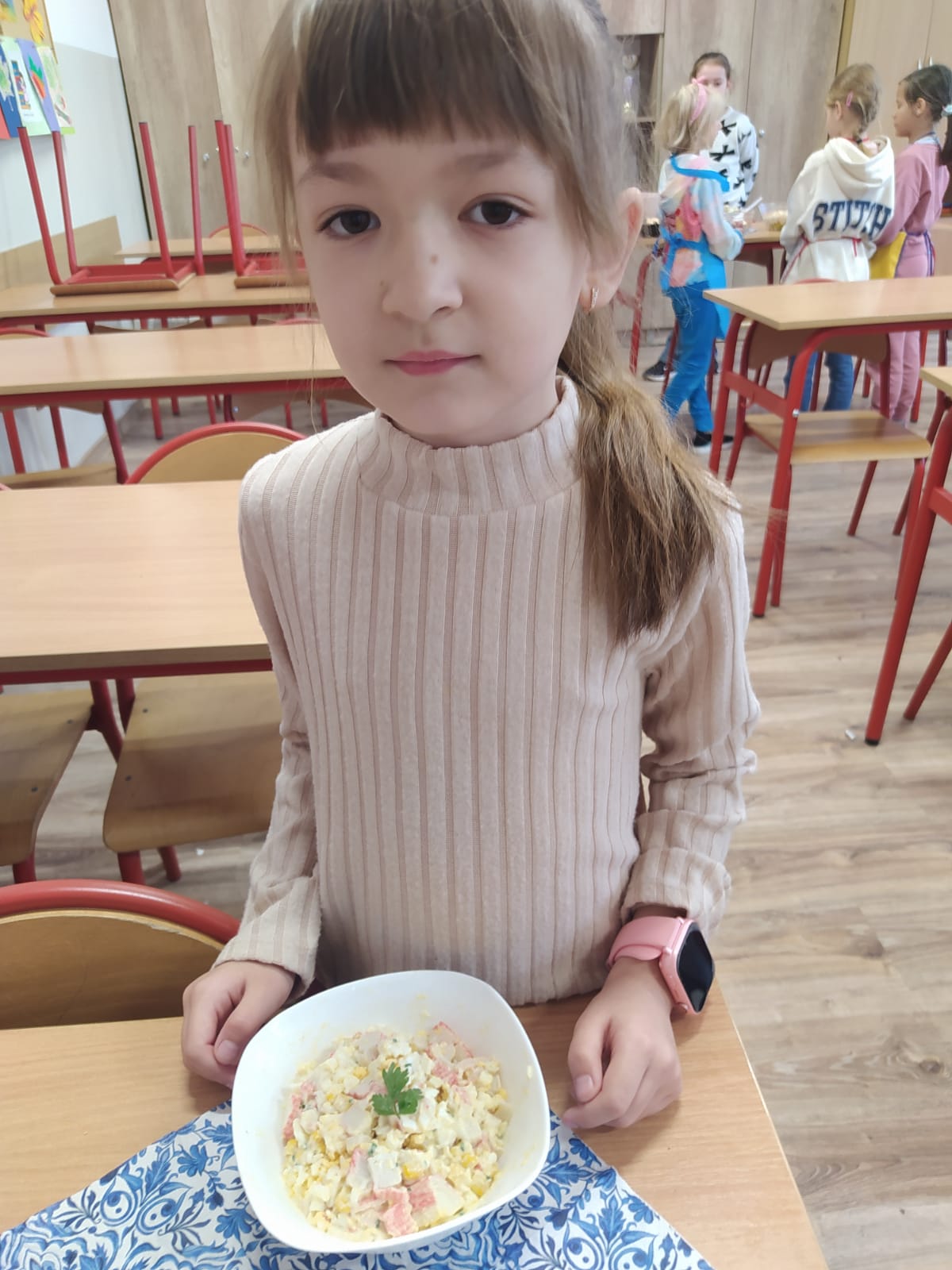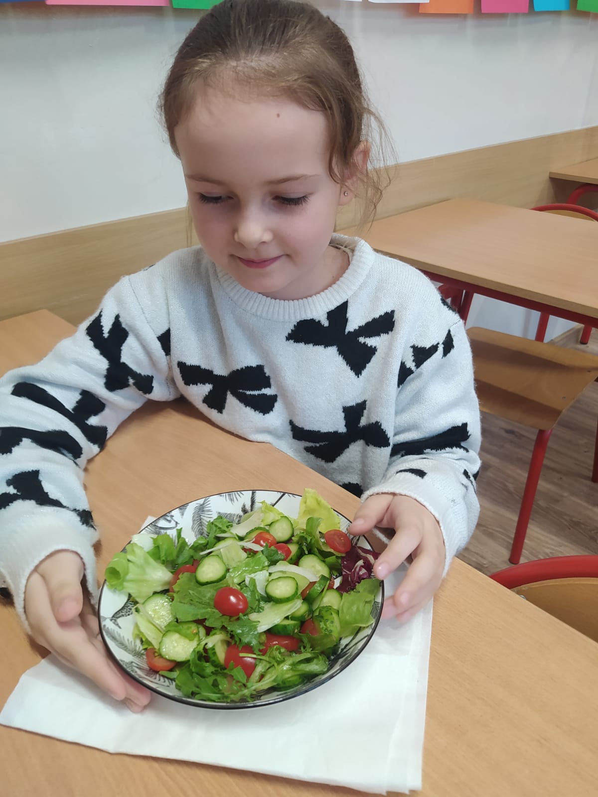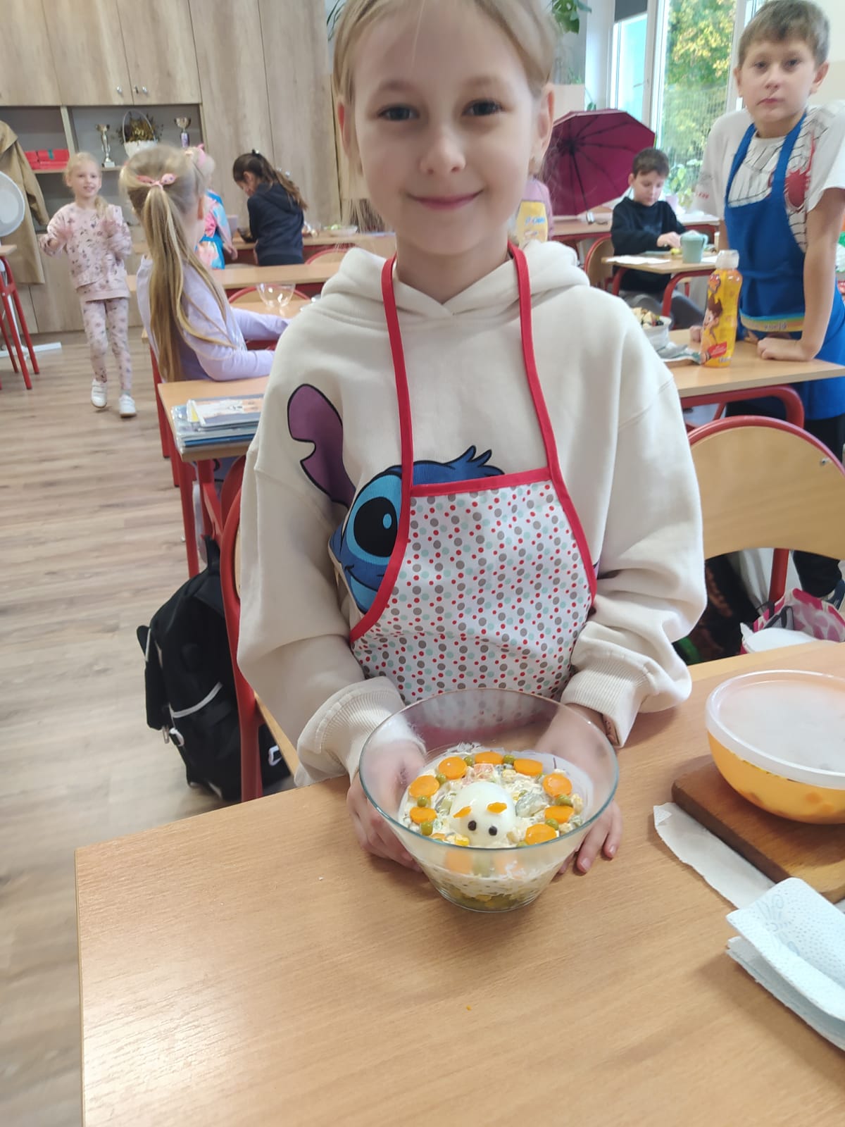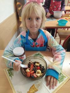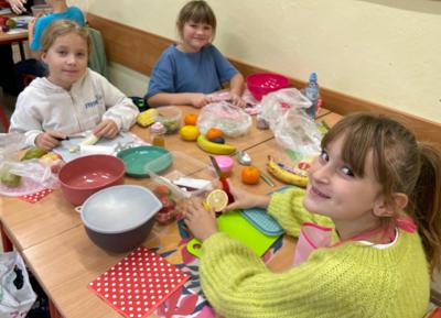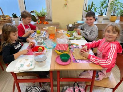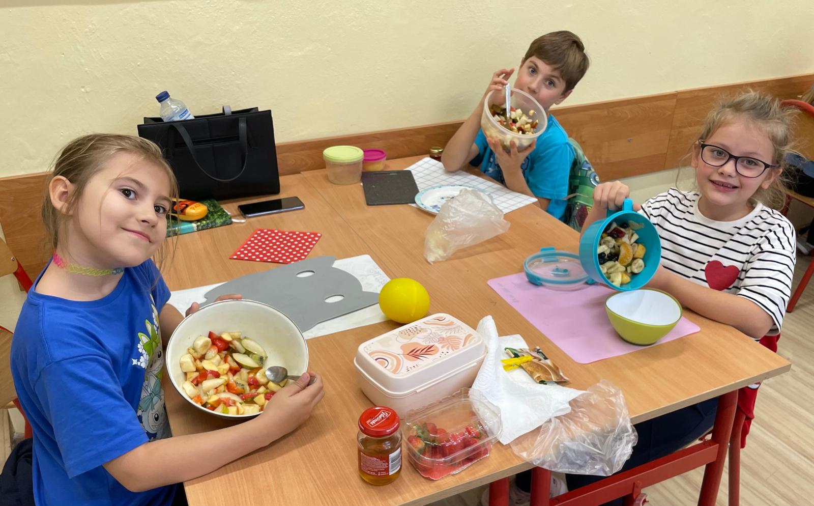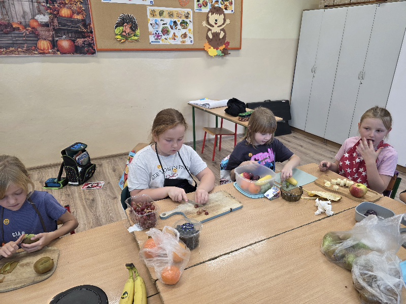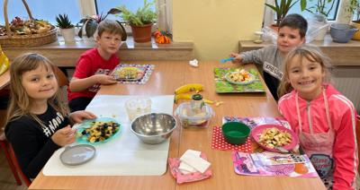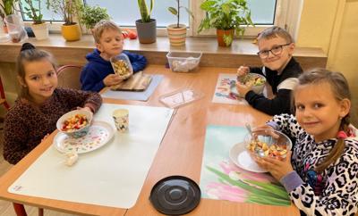 Podczas zajęć dzieci z zapałem przygotowywały pyszne i kolorowe sałatki jarzynowe oraz owocowe. Była to doskonała okazja, by porozmawiać o zdrowym odżywianiu, wartościach witamin i o tym, jak ważne są codzienne, małe wybory dla naszego samopoczucia.