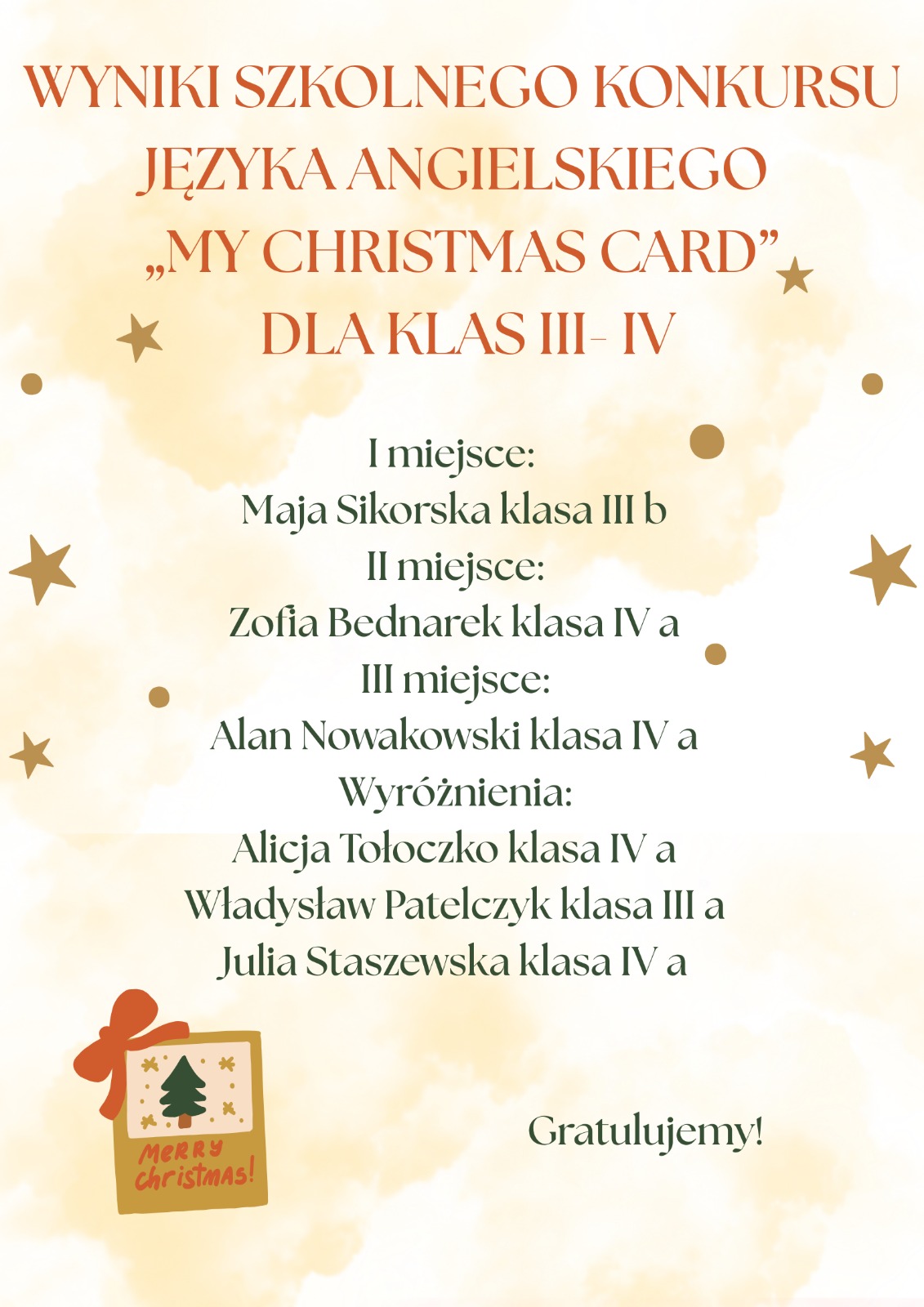 Wyniki konkursu Galeria zdjęć Powiązane wiadomości MIKOŁAJKI Wizyta w Wielkiej Fabryce Elfów w Gdańsku Od lat gramy i pomagamy! Wyniki konkursu Spotkanie opłatkowe w 1B Projekt pocztówka Drukuj Udostępnij Data dodania: 15.12.2025 Wyświetlono: 35 Aktualności