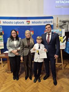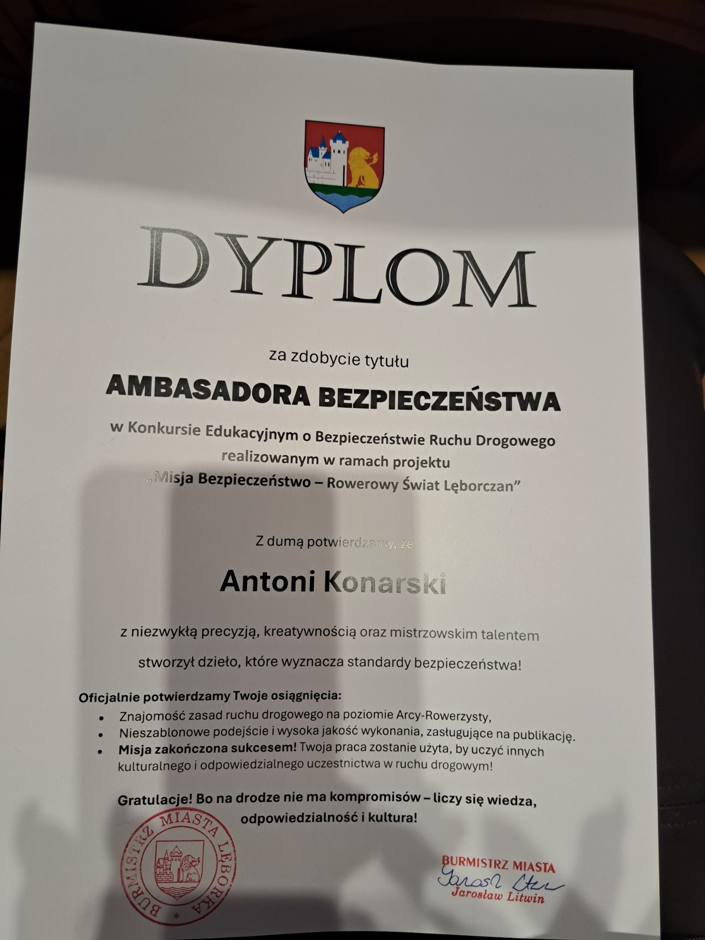 Miło poinformować, że uczeń kl. 3B - Antoni Konarski zdobył tytuł laureata w Miejskim Konkursie Edukacyjnym o Bezpieczeństwie Ruchu Drogowego realizowanym w ramach projektu - Misja Bezpieczeństwo - Rowerowy Świat Lęborczan. Antek z niezwykłą precyzją, kreatywnością oraz mistrzowskim talentem stworzył filmik nt. prawidłowej i ostrożnej jazdy na rowerze zachowując wszelkie standardy bezpieczeństwa. Uczeń odebrał w Urzędzie Miasta nagrodę oraz dyplom potwierdzający zdobycie przez niego tytułu AMBASADORA BEZPIECZEŃSTWA.