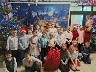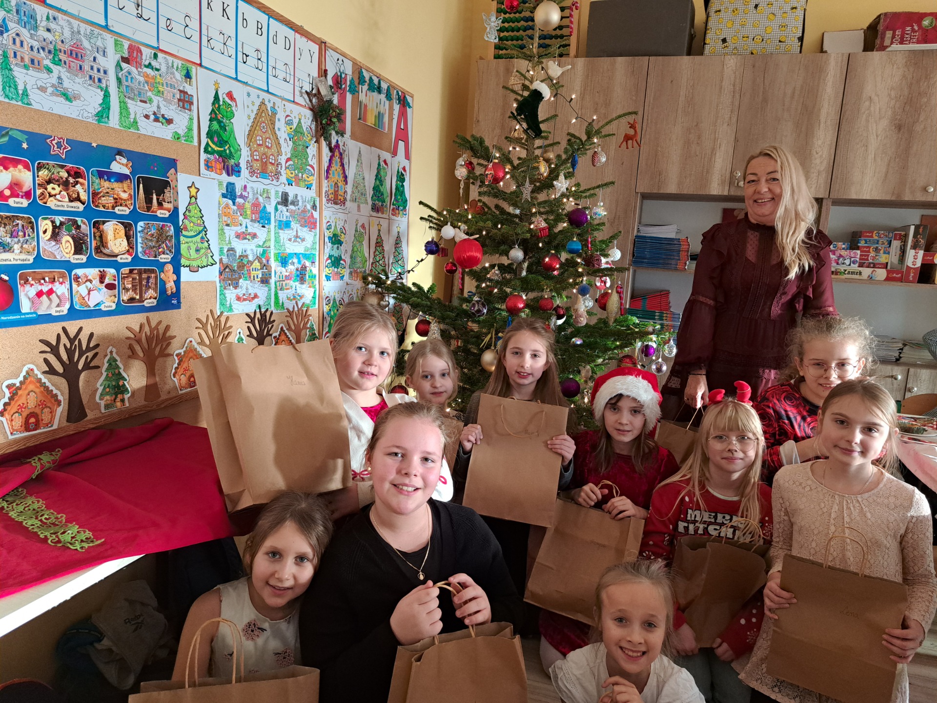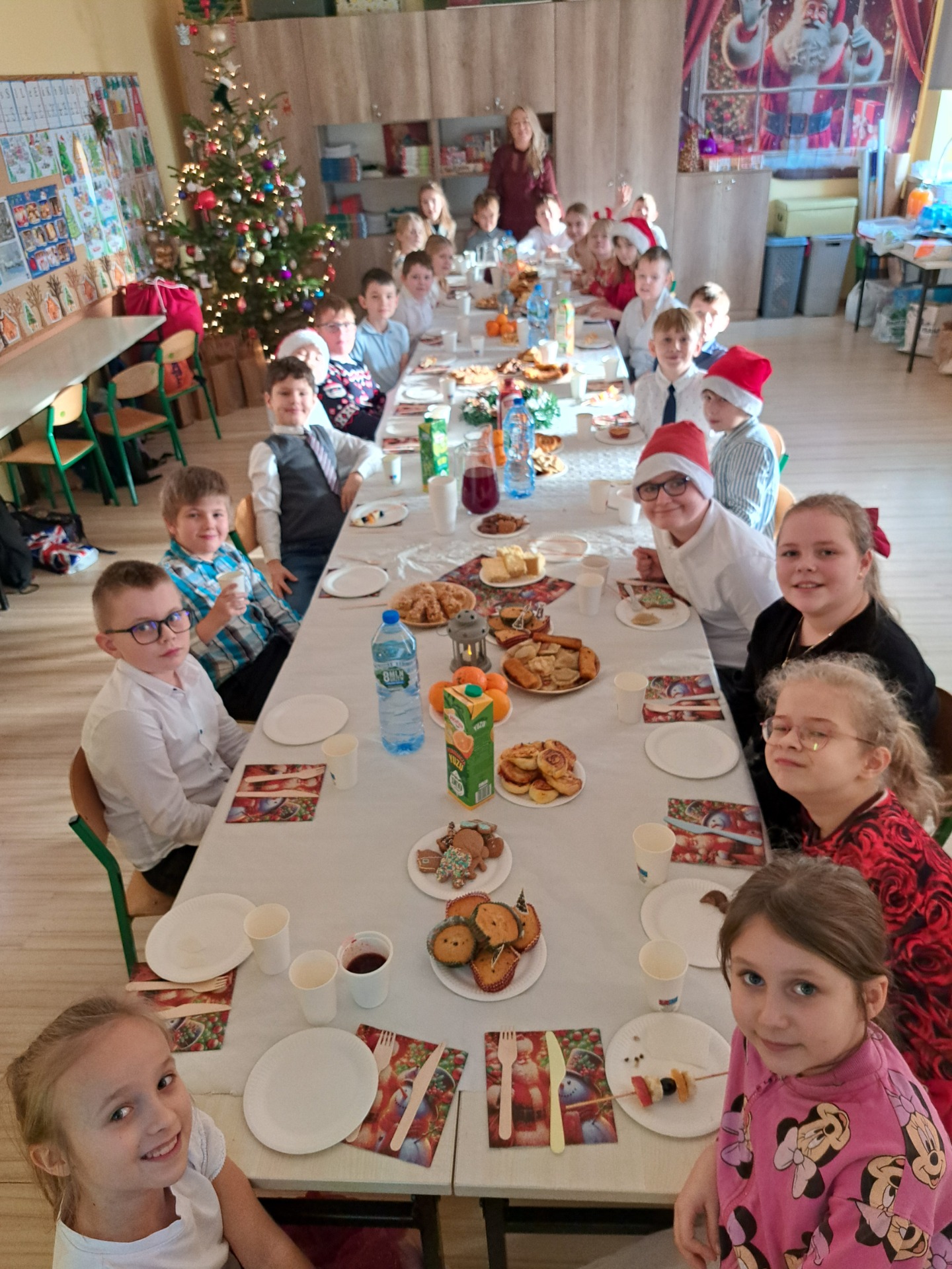 Dnia 16 grudnia 2025r. w kl. 3B odbyła się klasowa Wigilia. Rodzice uczniów przygotowali przepyszne potrawy. Na stole znalazły się pierogi, krokiety, paszteciki, barszcz, pierniki, ciasta i owoce. Podczas uroczystości uczniowie podzielili się opłatkiem oraz wspólnie śpiewali kolędy i pastorałki. Dużo radości sprawiły im prezenty znajdujące się pod choinką. Było miło, sympatycznie i przyjemnie.