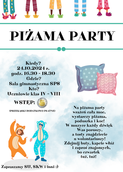 22.10.2024 Aktualności Piżama party Serdecznie zapraszamy uczniów klas IV-VIII do wspólnej zabawy! Gwarantujemy mnóstwo wrażeń, świetną atmosferę oraz smakołyki – zarówno słodkie, jak i słone. Dodatkowo,... Czytaj więcej